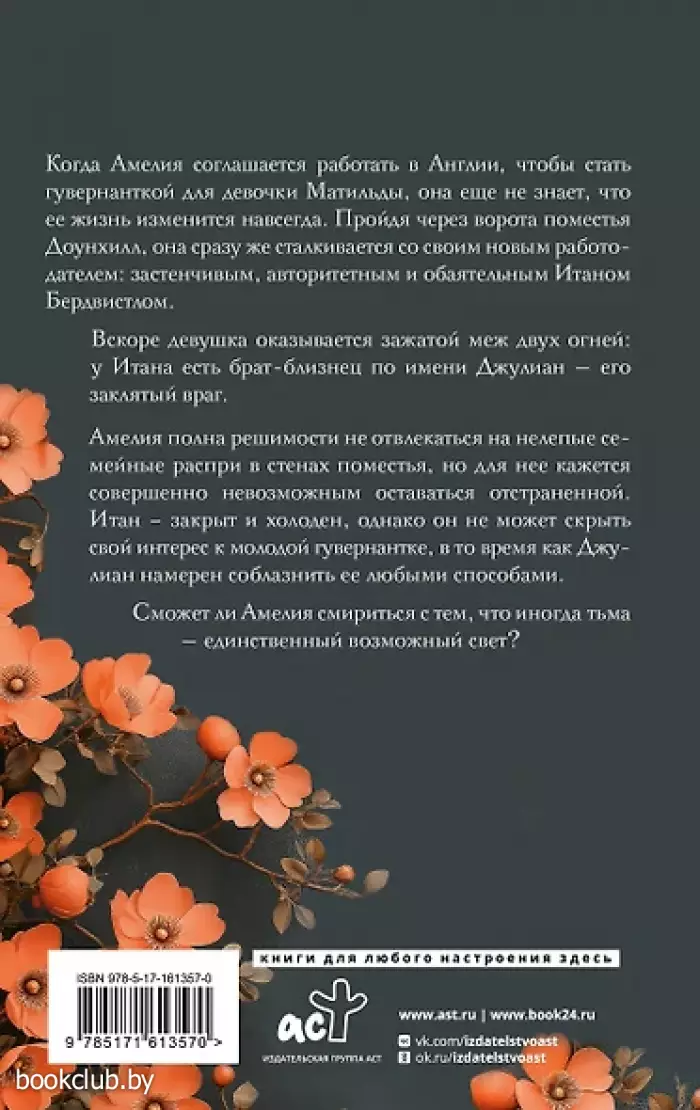 Когда Амелия соглашается работать в Англии, чтобы стать гувернанткой для девочки Матильды, она еще не знает, что ее жизнь изменится навсегда. Пройдя через ворота поместья Доунхилл, она сразу же сталкивается со своим новым работодателем: застенчивым, авторитетным и обаятельным Итаном Бердвистлом. Вскоре девушка оказывается зажатой меж двух огней: у Итана есть брат-близнец по имени Джулиан - его заклятый враг. Амелия полна решимости не отвлекаться на нелепые семейные распри в стенах поместья, но для нее кажется совершенно невозможным оставаться отстраненной. Итан - закрыт и холоден, однако он не может скрыть свой интерес к молодой гувернантке, в то время как Джулиан намерен соблазнить ее любыми способами. Сможет ли Амелия смириться с тем, что иногда тьма - единственный возможный свет?