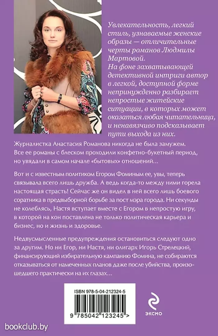 Журналистка Анастасия Романова никогда не была замужем. Все ее романы с блеском проходили конфетно-букетный период, но увядали в самом начале "бытовых" отношений… Вот и с известным политиком Егором Фоминым ее, увы, теперь связывала всего лишь дружба. А ведь когда-то между ними горела настоящая страсть! Сейчас же он видел в ней всего лишь боевого соратника в предвыборной борьбе за пост мэра города. Ни секунды не колеблясь, Настя вступает вместе с Егором в непростую игру, в которой на кон поставлена не только политическая карьера и бизнес, но и жизнь и здоровье. Недвусмысленные предупреждения остановиться следуют одно за другим. Но ни Егор, ни Настя, ни олигарх Игорь Стрелецкий, финансирующий избирательную кампанию Фомина, не собираются отказываться от намеченных планов даже после убийства, произошедшего практически на их глазах…