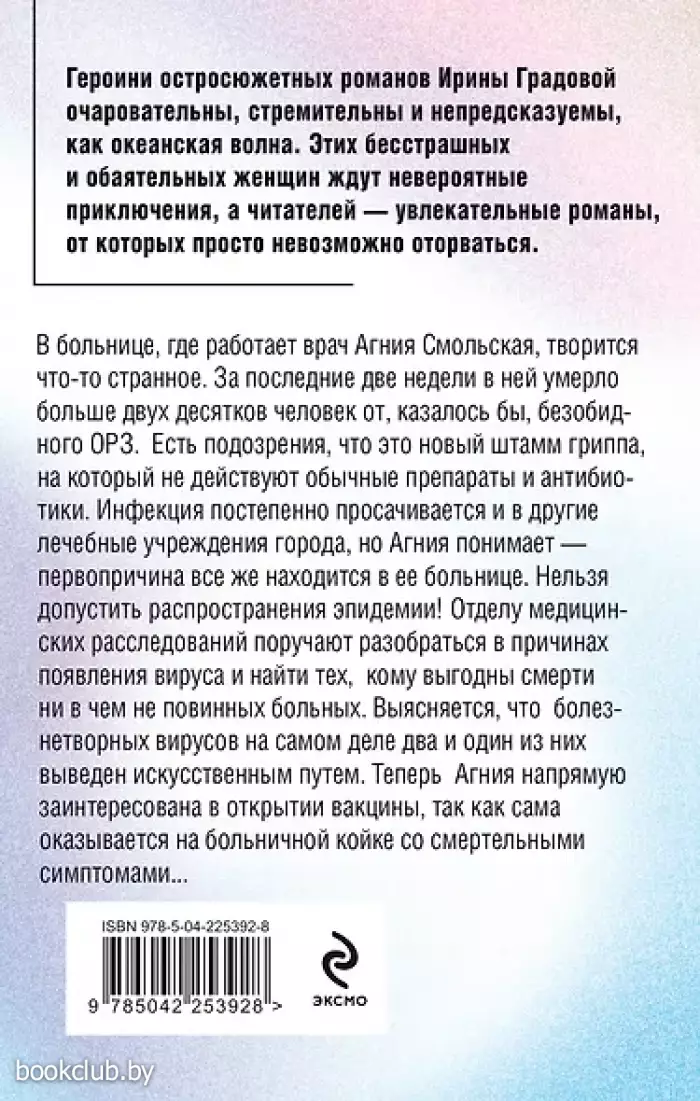 В больнице, где работает врач Агния Смольская, творится что-то странное. За последние две недели в ней умерло больше двух десятков человек от, казалось бы, безобидного ОРЗ. Есть подозрения, что это новый штамм гриппа, на который не действуют обычные препараты и антибиотики. Инфекция постепенно просачивается и в другие лечебные учреждения города, но Агния понимает — первопричина все же находится в ее больнице. Нельзя допустить распространение эпидемии! Отделу медицинских расследований поручают разобраться в причинах появления вируса и найти тех, кому выгодны смерти ни в чем неповинных больных. Выясняется, что болезнетворных вирусов на самом деле два, и один из них выведен искусственным путем. Теперь Агния напрямую заинтересована в открытии вакцины, так как сама оказывается на больничной койке со смертельными симптомами...