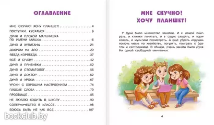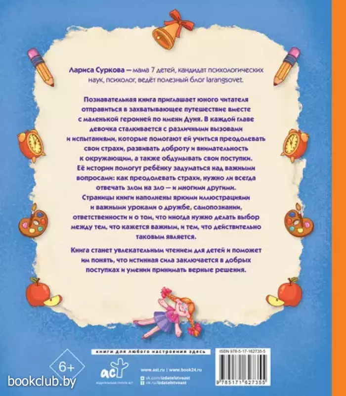 Познавательная книга приглашает юного читателей отправиться в захватывающее путешествие вместе с маленькой героиней по имени Дуня. В каждой главе девочка сталкивается с различными вызовами и испытаниями, которые помогают ей учиться преодолевать свои страхи, развивать доброту и внимательность к окружающим, а также обдумывать свои поступки. Её истории помогут ребёнку задуматься над важными вопросами: Как преодолевать страхи? Нужно ли всегда отвечать злом на зло? И многими другими.