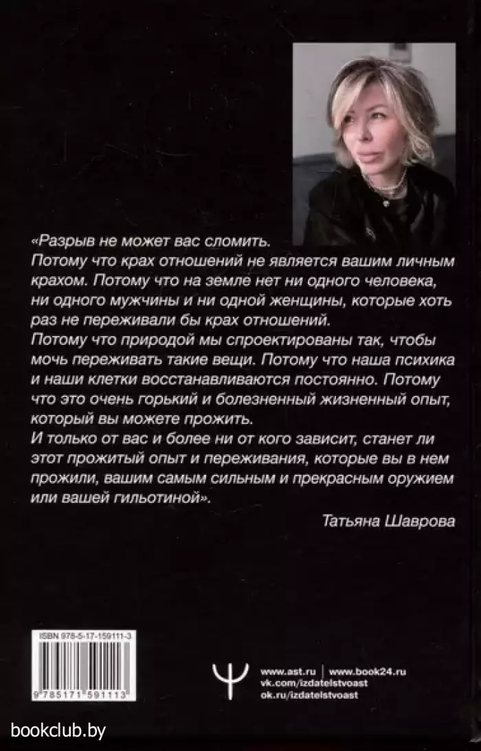 Вдребезги! Все разбилось вдребезги. Ваши совместные планы, мечты об общем будущем и воспоминания о прекрасных моментах в прошлом. Можно ли починить сердце, разбитое после тяжелого расставания? Можно ли вылечить боль, которую причинил близкий человек? Расставание может казаться вам катастрофой, трагедией, которую невозможно пережить. Но это не так! Важно помнить, что неудачи в личной жизни временны, и их переживают все. Нужно только набраться мужества и терпения, чтобы с ними справиться. В этом вам поможет Татьяна Шаврова — популярный блогер и коуч отношений с 15-летним опытом работы на ТВ. Новая книга автора — это ваш друг, который поможет вам восстановиться после расставания и обрести уверенность, принять и полюбить себя. В тексте вы найдете множество полезных советов и практик, которые избавят вас от грусти и одиночества, помогут пережить непростой период и выйти из него на путь к новой жизни. Эта книга — не о вашем бывшем. Она — о вашем будущем. Она о любви к себе и заботе о себе. Эта книга поможет вам: · пережить тяжелое расставание; · справиться со стрессом и другими негативными эмоциональными состояниями после расставания; · обрести веру в себя, людей и собственное счастье; · научиться принимать, любить и ценить себя, заботиться о себе; · избавиться от чувства вины и одиночества. Помните, первый шаг к личному счастью — это вера в лучшее и любовь к себе! Книга в твердой обложке. Бумага офсетная.