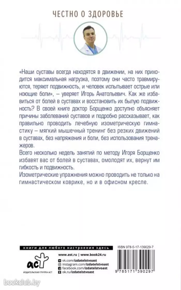 "Наши суставы всегда находятся в движении, на них приходится максимальная нагрузка, поэтому они часто травмируются, теряют подвижность, и человек испытывает острые или ноющие боли", — уверяет Игорь Анатольевич. Как же избавиться от болей в суставах и восстановить их былую подвижность? В своей книге доктор Борщенко доступно объясняет причины заболеваний суставов и подробно рассказывает, как правильно проводить лечебную изометрическую гимнастику — мягкий мышечный тренинг без резких движений в суставах, без напряжения и боли, без использования тренажеров.