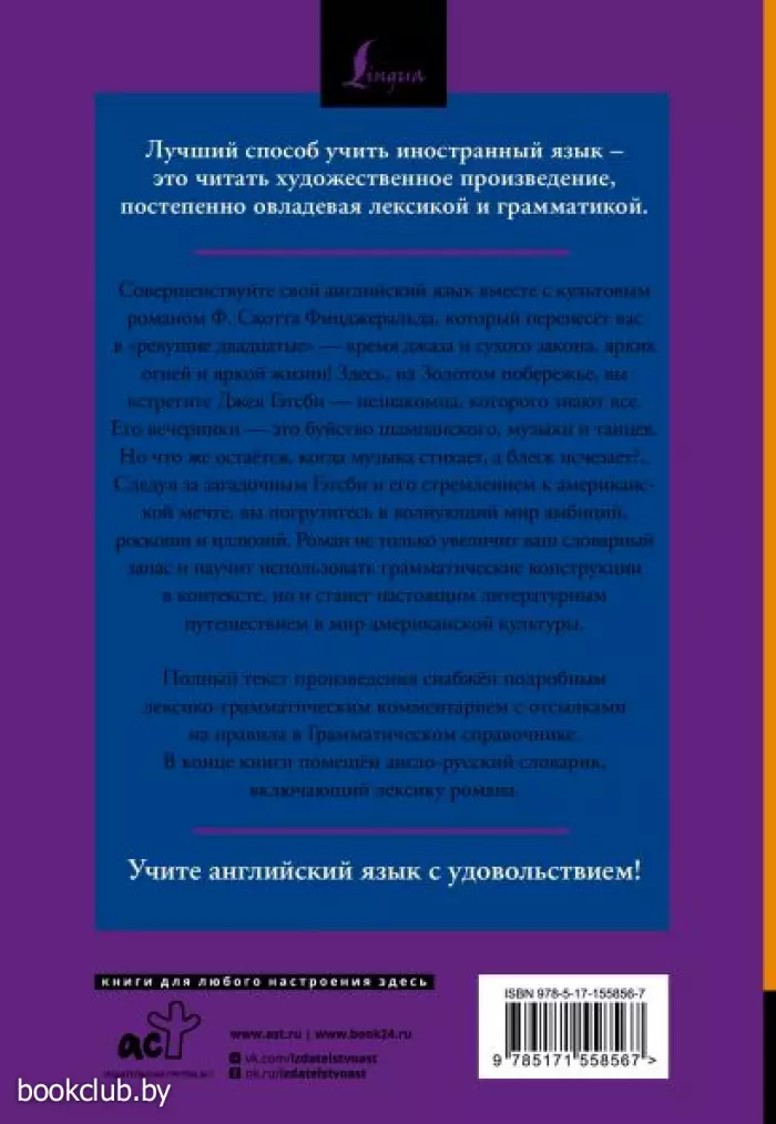 Совершенствуйте свой английский язык вместе с культовым романом Ф. Скотта Фицджеральда, который перенесёт вас в "ревущие двадцатые" — время джаза и сухого закона, ярких огней и яркой жизни! Здесь, на Золотом побережье, вы встретите Джея Гэтсби – незнакомца, которого знают все. Его вечеринки – это буйство шампанского, музыки и танцев. Но что же остаётся, когда музыка стихает, а блеск исчезает?.. Следуя за загадочным Гэтсби и его стремлением к американской мечте, вы погрузитесь в волнующий мир амбиций, роскоши и иллюзий. Роман не только увеличит ваш словарный запас и научит использовать грамматические конструкции в контексте, но и станет настоящим литературным путешествием в мир американской культуры.