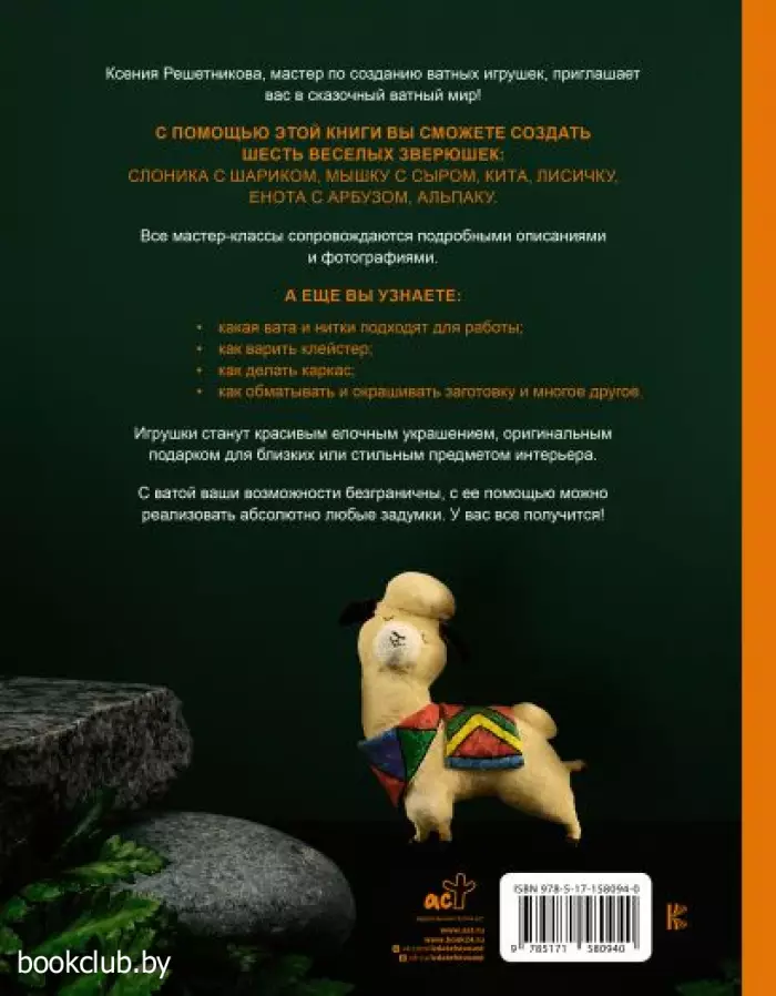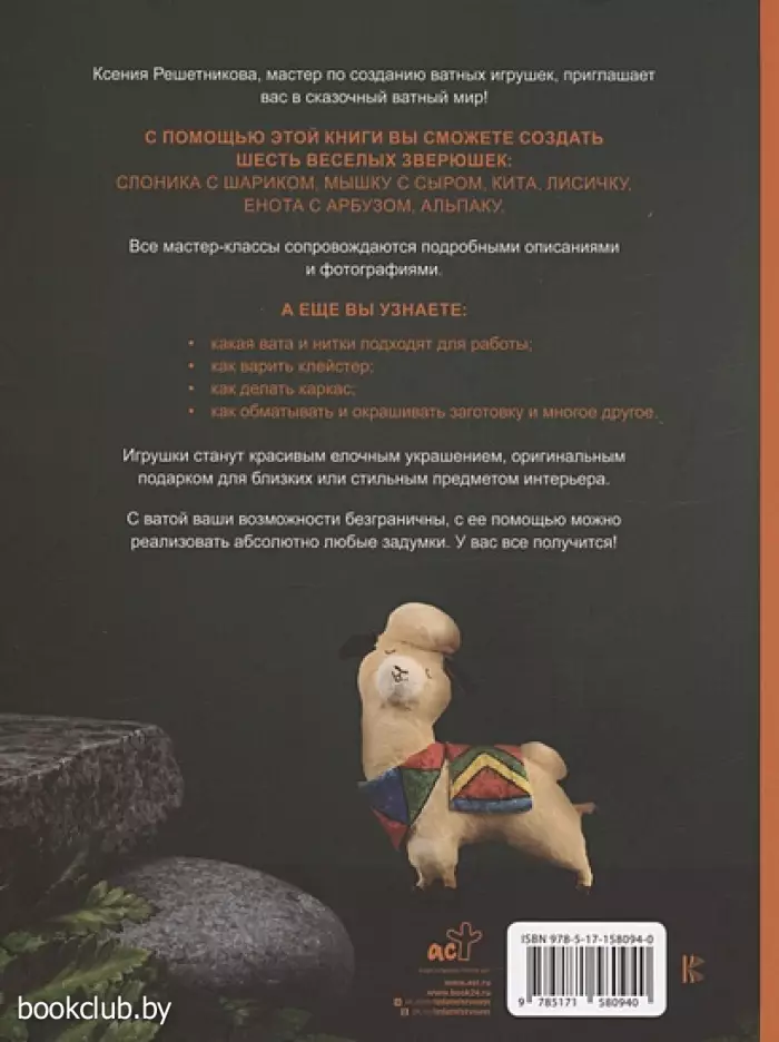 С помощью этой книги вы сможете создать шесть веселых зверюшек: слоника с шариком, мышку с сыром, кита, лисичку, енота с арбузом, альпаку.