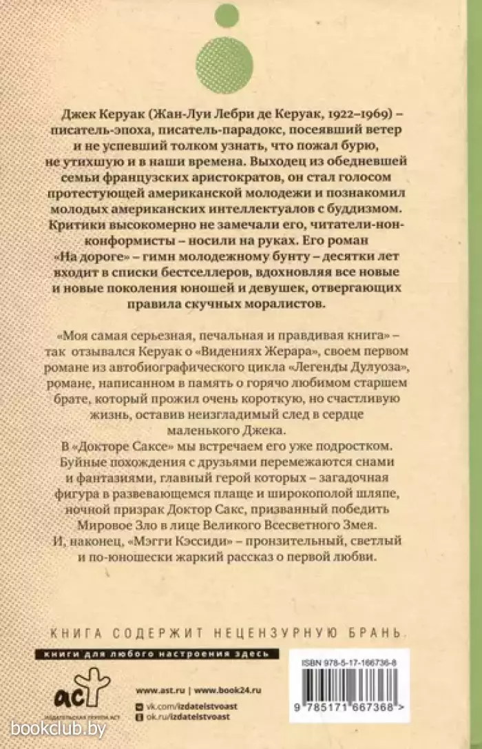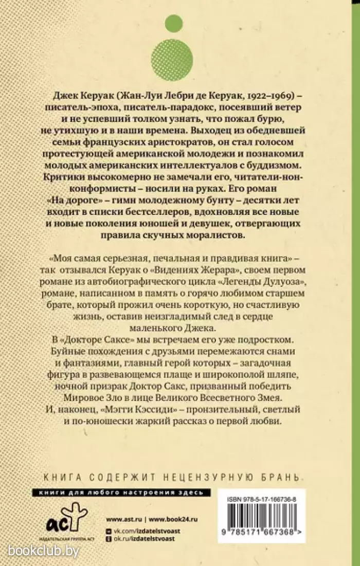 Джек Керуак (Жан-Луи Лебри де Керуак, 1922–1969) – писатель-эпоха, писатель-парадокс, посеявший ветер и не успевший толком узнать, что пожал бурю, не утихшую и в наши времена. Выходец из обедневшей семьи французских аристократов, он стал голосом протестующей американской молодежи и познакомил молодых американских интеллектуалов с буддизмом. «Моя самая серьезная, печальная и правдивая книга», – так отзывался Керуак о «Видениях Жерара», своем первом романе из автобиографического цикла «Легенды Дулуоза», романе, написанном в память о горячо любимом старшем брате, который прожил очень короткую, но счастливую жизнь, оставив неизгладимый след в сердце маленького Джека. В «Докторе Саксе» мы встречем его уже подростком. Буйные похождения с друзьями перемежаются снами и фантазиями, главный герой которых – загадочная фигура в развевающемся плаще и широкополой шляпе, ночной призрак Доктор Сакс, призванный победить Мировое Зло в лице Великого Всесветного Змея. И, наконец, «Мэгги Кэссиди» – пронзительный, светлый и по-юношески жаркий рассказ о первой любви.