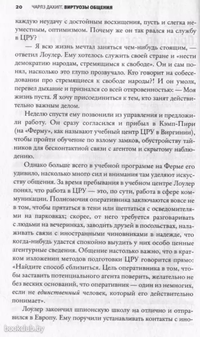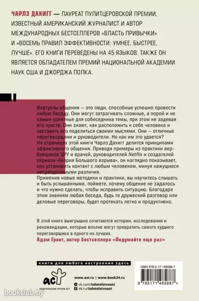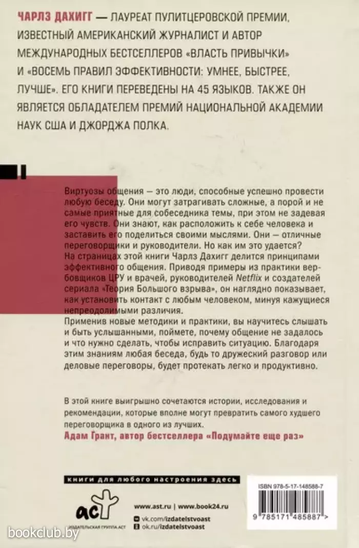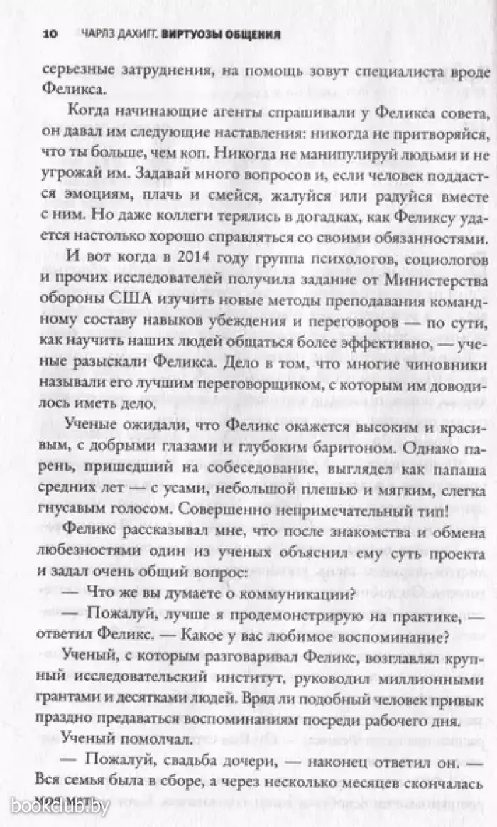 Виртуозы общения – это люди, способные успешно провести любую беседу. Они могут затрагивать сложные, а порой и не самые приятные темы для собеседника, при этом не задевая его чувств. Они знают, как расположить к себе человека и заставить его поделиться своими мыслями. Они – отличные переговорщики и руководители. Но как им это удается? На страницах этой книги Чарлз Дахигг делится принципами эффективного общения. Приводя примеры из практики вербовщиков ЦРУ и врачей, руководителей Netflix и создателей сериала «Теория Большого взрыва», он наглядно показывает, как установить контакт с любым человеком, минуя кажущиеся непреодолимыми различия. Применив новые методики и практики, вы научитесь слышать и быть услышанными, поймете, почему общение не задалось и что нужно сделать, чтобы исправить ситуацию. Благодаря этим знаниям любая беседа, будь то дружеский разговор или деловые переговоры, будет протекать легко и продуктивно.