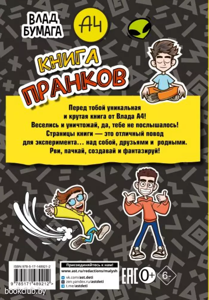 Книга «Влад А4. Книга пранков» не только принесёт множество приятных эмоций, но и может послужить замечательным подарком для ваших близких. Для вашего удобства при оформлении заказа по телефону назовите код товара: 404662