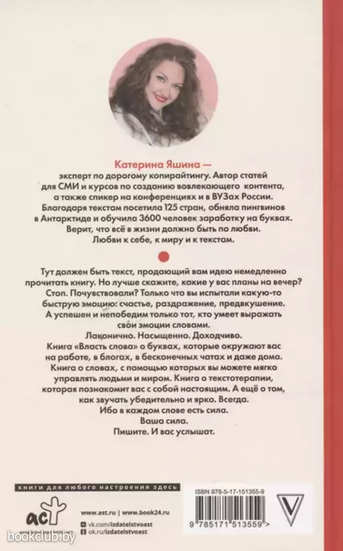 Книга «Власть текста» о буквах, которые окружают вас на работе, в блогах, в бесконечных чатах и даже дома. Книга о словах, с помощью которых вы можете мягко управлять людьми и миром. Книга о текстотерапии, которая познакомит вас с собой настоящим. А ещё о том, как звучать убедительно и ярко. Всегда.