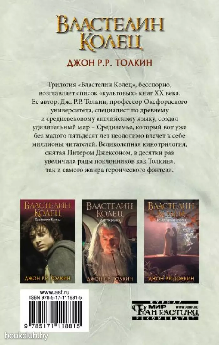 Книги издательства «АСТ» из серии «Толкин. Кино» станут прекрасным дополнением вашей библиотеки. Для вашего удобства при оформлении заказа по телефону назовите код товара: 166323