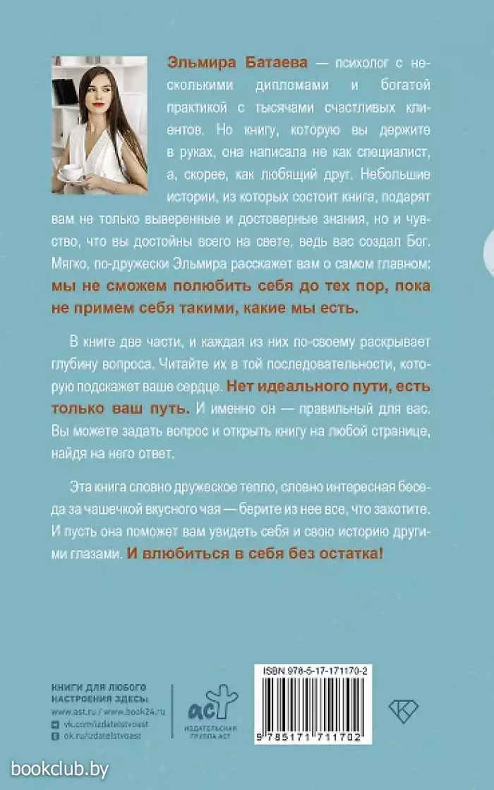 Эльмира Батаева — психолог с несколькими дипломами и богатой практикой с тысячами счастливых клиентов. Но книгу, которую вы держите в руках, она написала не как специалист, а, скорее, как любящий друг. Небольшие истории, из которых состоит книга, подарят вам не только выверенные и достоверные знания, но и чувство, что вы достойны всего на свете, ведь вас создал Бог. Мягко, по-дружески Эльмира расскажет вам о самом главном: мы не сможем полюбить себя до тех пор, пока не примем себя такими, какие мы есть. В книге две части, и каждая из них по-своему раскрывает глубину вопроса. Читайте их в той последовательности, которую подскажет ваше сердце. Нет идеального пути, есть только ваш путь. И именно он — правильный для вас. Вы можете задать вопрос и открыть книгу на любой странице, найдя на него ответ. Эта книга словно дружеское тепло, словно интересная беседа за чашечкой вкусного чая — берите из нее все, что захотите. И пусть она поможет вам увидеть себя и свою историю другими глазами. И влюбиться в себя без остатка!