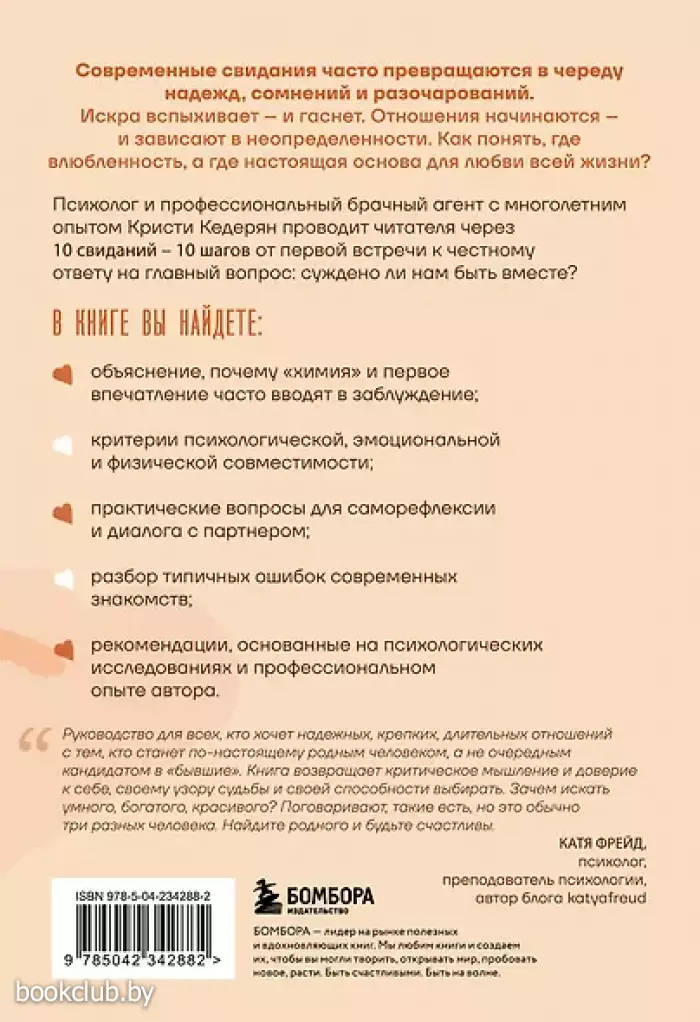 Почему одни отношения заканчиваются после пары свиданий, а другие перерастают в любовь всей жизни? Эта книга — честный, глубокий и при этом практичный гид по современным свиданиям. Автор, психолог и профессиональный брачный агент с многолетним опытом, Кристи Кедерян предлагает проверенный метод 10 свиданий, который поможет осознанно выбрать партнера для долгих и здоровых отношений. Вы узнаете: 1. почему «химия» может обманывать и как отличить влюбленность от настоящей совместимости; 2. какие вопросы важно задавать себе и партнеру на каждом этапе знакомства; 3. как распознать реальные красные флаги и не спутать их с собственными страхами и травмами; 4. как не торопиться и не застрять в неопределенности; 5. как завершить поиски и начать отношения с тем самым человеком. Книги издательства «ЭКСМО» из серии «Облики любви. Посмотри на отношения другими глазами» станут прекрасным дополнением вашей библиотеки. Для вашего удобства при оформлении заказа по телефону назовите код товара: 417006