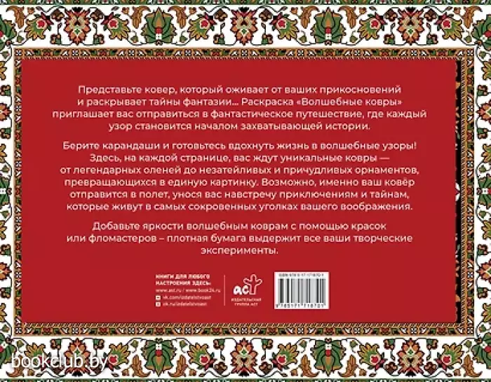 Берите карандаши и готовьтесь вдохнуть жизнь в волшебные узоры! Здесь, на каждой странице, вас ждут уникальные ковры – от легендарных оленей до незатейливых и причудливых орнаментов, превращающихся в единую картинку. Возможно, именно ваш ковёр отправится в полет, унося вас навстречу приключениям и тайнам, которые живут в самых сокровенных уголках вашего воображения.