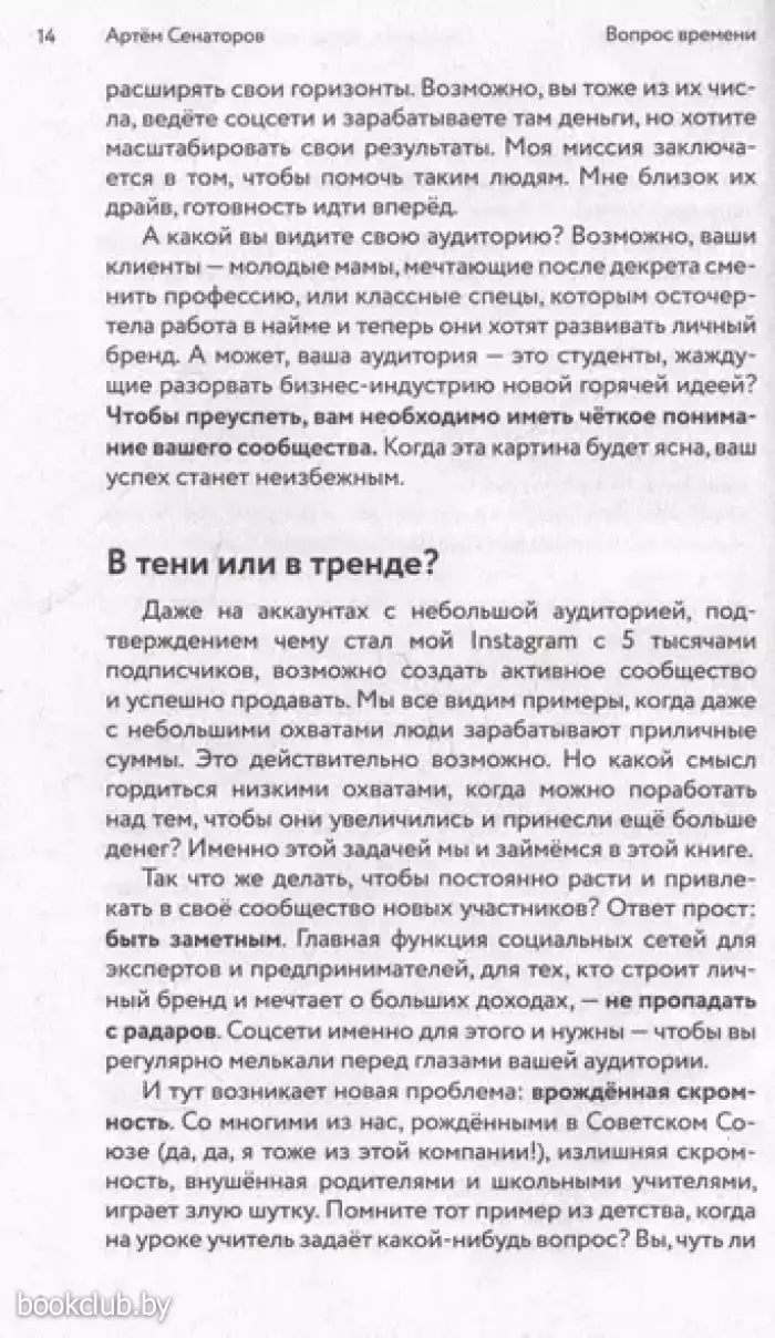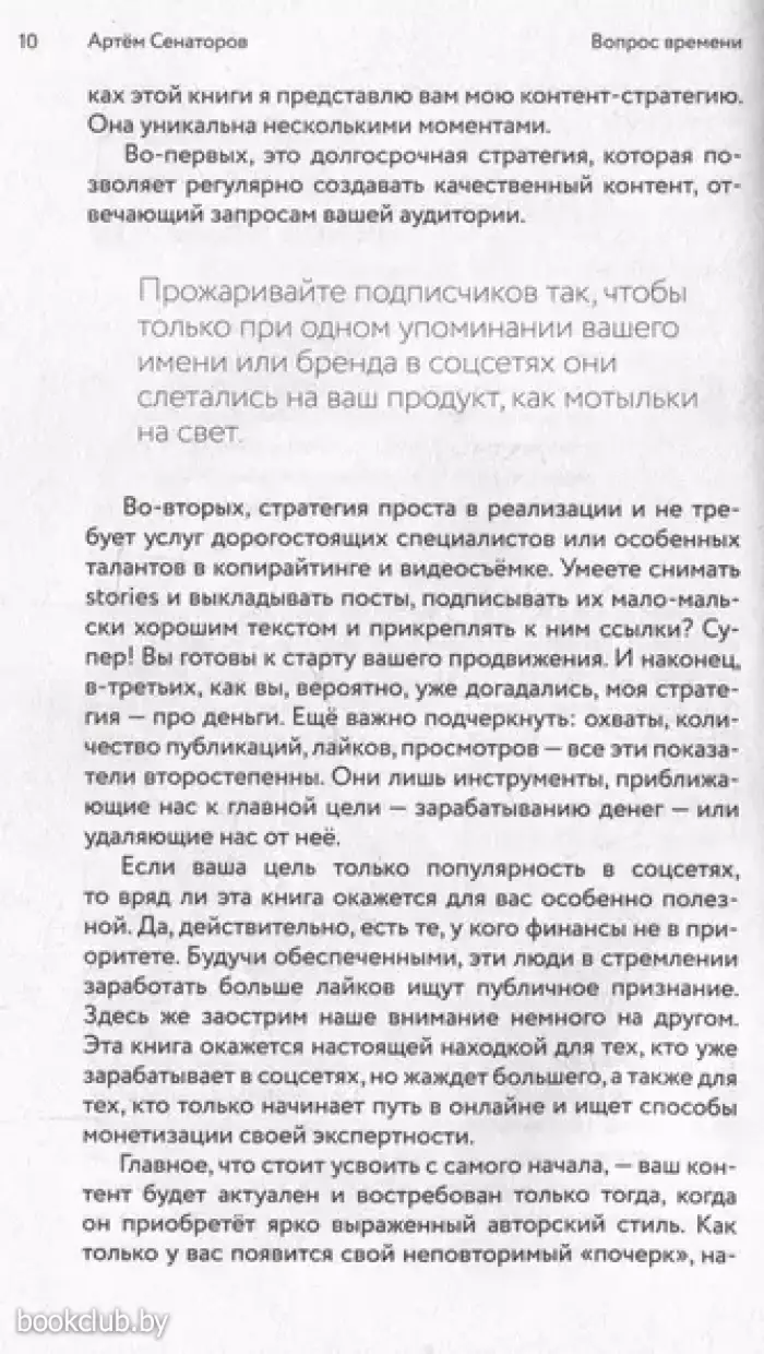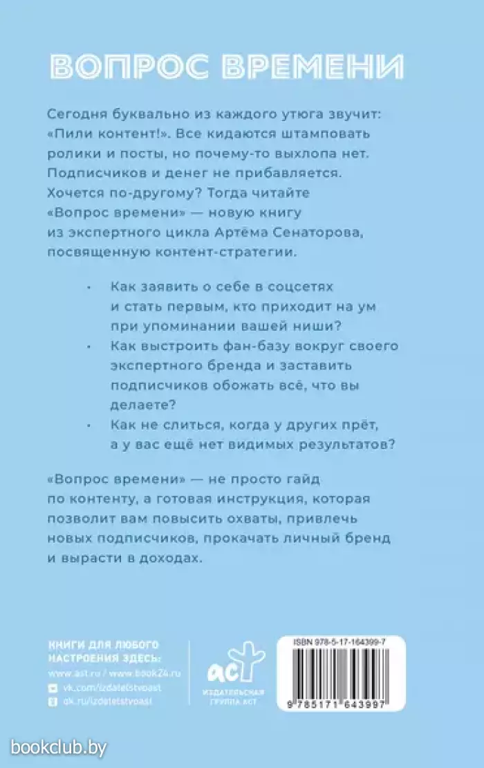 Сегодня буквально из каждого утюга звучит: «Пили контент!» Все кидаются штамповать ролики и посты, но почему-то выхлопа нет. Подписчиков и денег не прибавляется. Хочется по-другому? Тогда читайте «Вопрос времени» — новую книгу из экспертного цикла Артёма Сенаторова, посвященную контентстратегии.