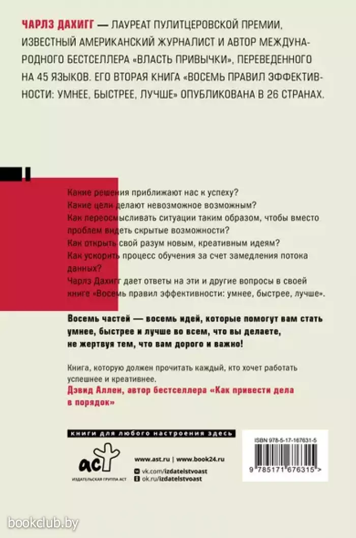 Какие решения приближают нас к успеху? Какие цели делают невозможное возможным? Как переосмысливать ситуации таким образом, чтобы вместо проблем видеть скрытые возможности? Как открыть свой разум новым, креативным идеям? Как ускорить процесс обучения за счет замедления потока данных? Чарлз Дахигг дает ответы на эти и другие вопросы в своей книге "Восемь правил эффективности: умнее, быстрее, лучше". Восемь частей — восемь идей, которые помогут вам стать умнее, быстрее и лучше во всем, что вы делаете, не жертвуя тем, что вам дорого и важно!