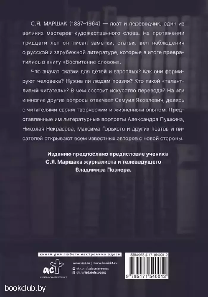 Самуил Яковлевич Маршак (1887 — 1964) — поэт и переводчик, один из великих мастеров художественного слова. На протяжении тридцати лет он писал заметки, статьи, вел наблюдения о русской и зарубежной литературе, которые в итоге превратились в книгу «Воспитание словом».