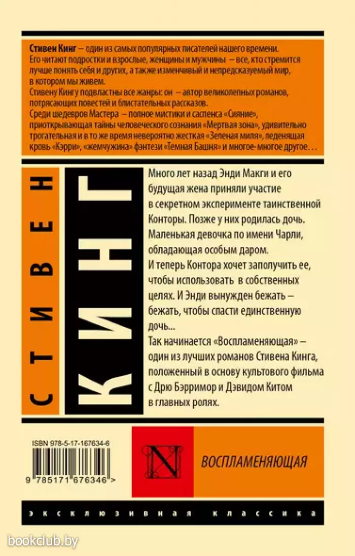 Много лет назад Энди Макги и его будущая жена приняли участие в секретном эксперименте таинственной Конторы. Позже у них родилась дочь. Маленькая девочка по имени Чарли, обладающая особым даром. И теперь Контора хочет заполучить ее, чтобы использовать в собственных целях. И Энди вынужден бежать — бежать, чтобы спасти единственную дочь… Так начинается «Воспламеняющая» — один из лучших романов Стивена Кинга, положенный в основу культового фильма с Дрю Бэрримор и Дэвидом Китом в главных ролях.