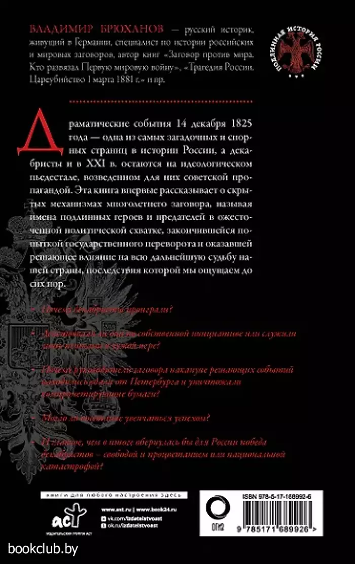 Драматические события 14 декабря 1825 года – одна из самых загадочных и спорных страниц в истории России, а декабристы и в XXI веке остаются на идеологическом пьедестале, возведенном для них советской пропагандой. Эта книга впервые рассказывает о скрытых механизмах многолетнего заговора, называя имена подлинных героев и предателей в ожесточенной политической схватке, закончившейся попыткой государственного переворота и оказавшей решающее влияние на всю дальнейшую судьбу нашей страны, последствия которой мы ощущаем до сих пор. Почему декабристы проиграли? Действовали ли они по собственной инициативе или служили лишь пешками в чужой игре? Почему руководители заговора накануне решающих событий находились вдали от Петербурга и уничтожали компрометирующие бумаги? Почему предводители восстания вообще не явились на Сенатскую площадь? Если декабристы были теми рыцарями без страха и упрека, какими их принято изображать, то почему столь многие из них сломались на следствии, отреклись и покаялись? Могло ли восстание увенчаться успехом? И, главное, чем в итоге обернулась бы для России победа декабристов – свободой и процветанием или национальной катастрофой?