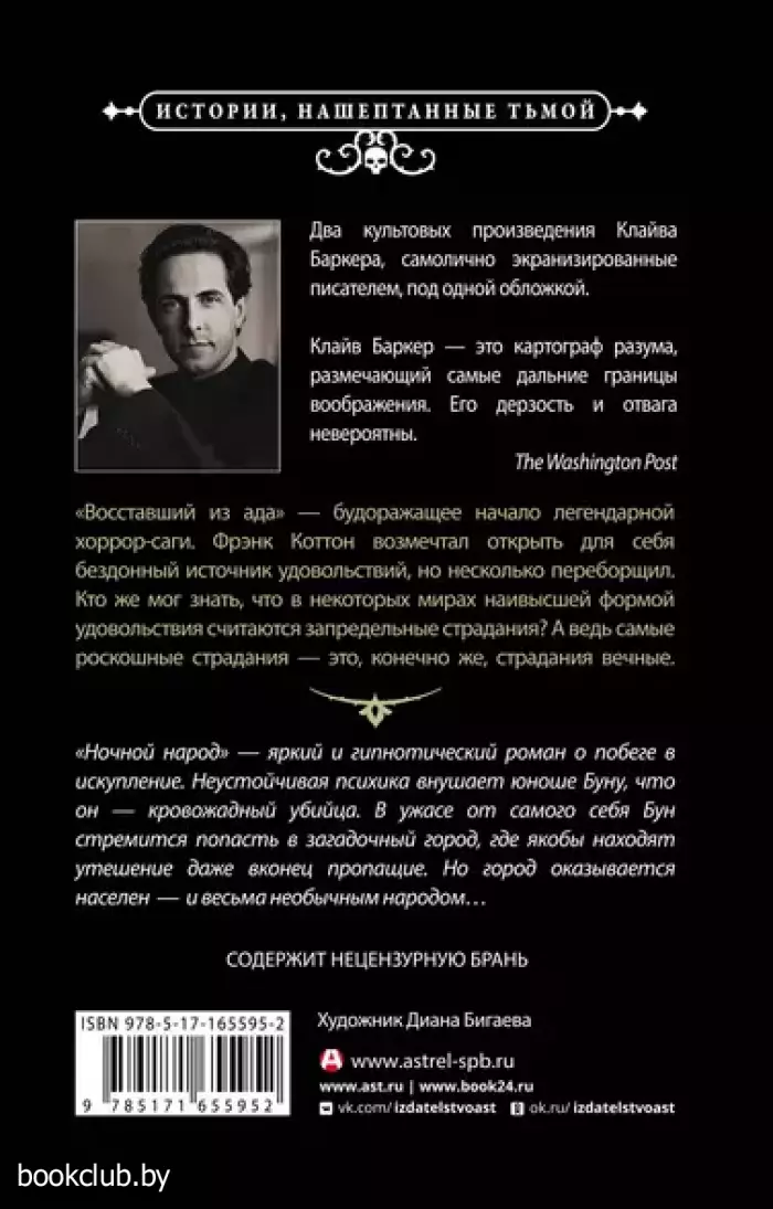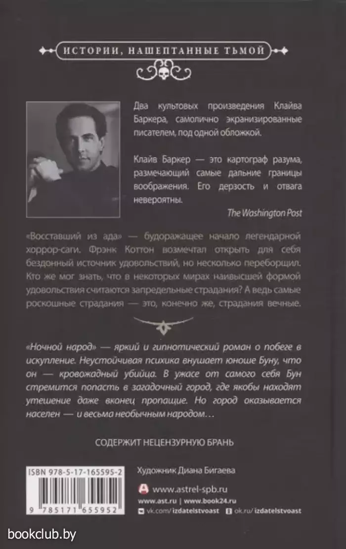 Два культовых произведения Клайва Баркера под одной обложкой. Фрэнк Коттон открывает таинственную шкатулку Лемаршана, надеясь тем самым добраться до источника неземных наслаждений. Однако в разных мирах и представления о наслаждениях разные, не правда ли? Юный Бун, отчаянно желая смыть с себя тяжкий грех многократного убийства, ищет легендарный город Мидиан. Бун надеется обрести там отпущение, но ведь любой город — в первую очередь место, где кто-то живет… В книгу вошли знаменитая повесть «Восставший из ада», положившая начало одному из известнейших хоррор-циклов в истории, и роман «Ночной народ».