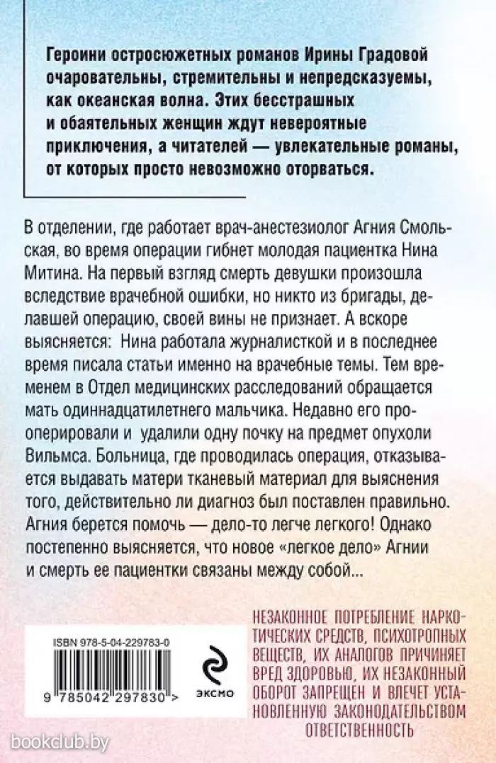 Героини остросюжетных романов Ирины Градовой очаровательны, стремительны и непредсказуемы, как океанская волна — самая настоящая стихия. Этих бесстрашных и обаятельных женщин ждут невероятные приключения, а читателей — увлекательные романы, от которых просто невозможно оторваться.