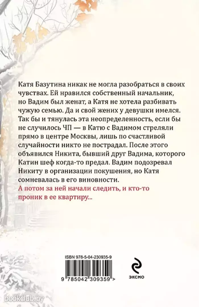 Катя Базутина никак не могла разобраться в своих чувствах. Ей нравился собственный начальник, но Вадим был женат, а Катя не хотела разбивать чужую семью. Да и свой жених у девушки имелся. Так бы и тянулась эта неопределенность, если бы не случилось ЧП — в Катю с Вадимом стреляли прямо в центре Москвы, лишь по счастливой случайности никто не пострадал. После этого объявился Никита, бывший друг Вадима, которого Катин шеф когда-то предал. Вадим подозревал Никиту в организации покушения, но Катя сомневалась в его виновности. А потом за ней начали следить, и кто-то проник в ее квартиру...