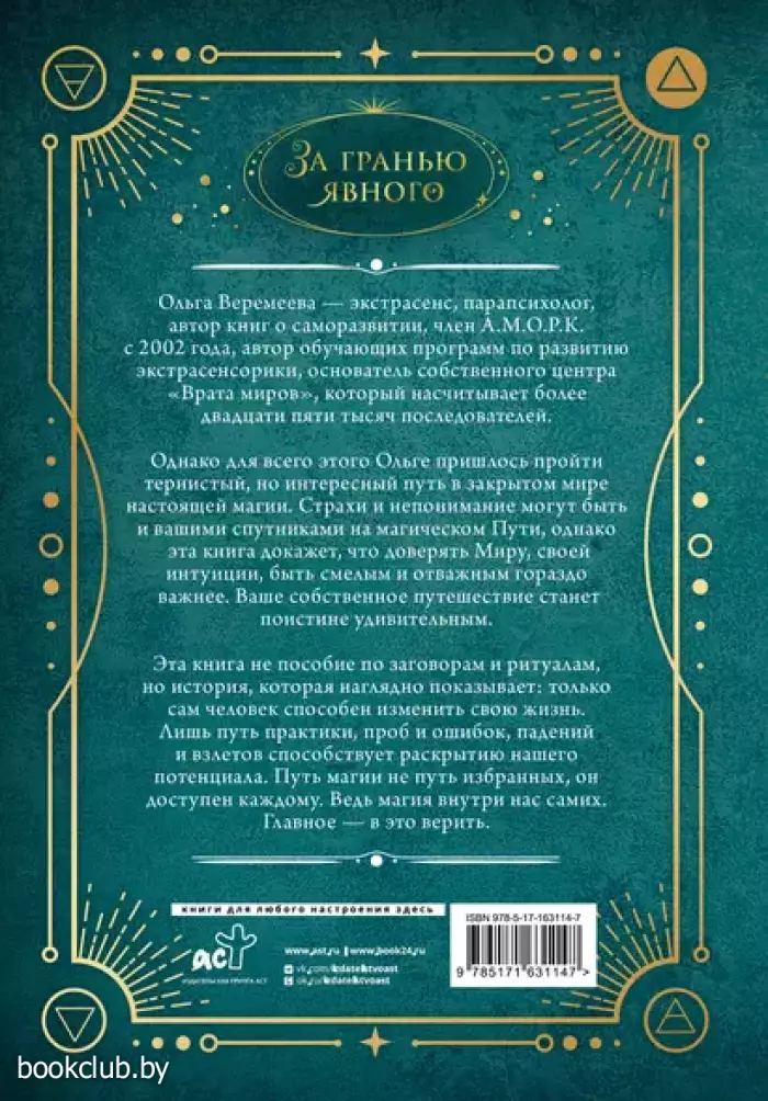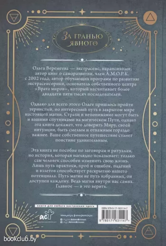 Ольга Веремеева — экстрасенс, парапсихолог, автор книг о саморазвитии, член А.М.О.Р.К. с 2002 года, автор обучающих программ по развитию экстрасенсорики, основатель собственного центра «Врата миров», который насчитывает более двадцати пяти тысяч последователей. Однако для всего этого Ольге пришлось пройти тернистый, но интересный путь в закрытом мире настоящей магии. Страхи и непонимание могут быть и вашими спутниками на магическом Пути, однако эта книга докажет, что доверять Миру, своей интуиции, быть смелым и отважным гораздо важнее. Ваше собственное путешествие станет поистине удивительным. Эта книга не пособие по заговорам и ритуалам, но история, которая наглядно показывает: только сам человек способен изменить свою жизнь. Лишь путь практики, проб и ошибок, падений и взлетов способствует раскрытию нашего потенциала. Путь магии не путь избранных, он доступен каждому. Ведь магия внутри нас самих. Главное — в это верить.