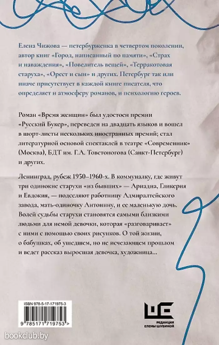 Елена Чижова — петербурженка в четвертом поколении, автор книг «Город, написанный по памяти», «Страх и наваждения», «Повелитель вещей», «Терракотовая старуха», «Орест и сын» и других. Петербург так или иначе присутствует в каждой книге писателя, что определяет и атмосферу романов, и психологию героев. Роман «Время женщин» был удостоен премии «Русский Букер», переведен на двадцать языков и вошел в шорт-листы нескольких иностранных премий; стал литературной основой спектаклей в театре «Современник» (Москва), БДТ им. Г.А. Товстоногова (Санкт-Петербург) и других. Ленинград, рубеж 1950–1960-х. В коммуналку, где живут три одинокие старухи «из бывших» — Ариадна, Гликерия и Евдокия, — подселяют работницу Адмиралтейского завода, мать-одиночку Антонину, и ее маленькую дочь. Волей судьбы старухи становятся самыми близкими людьми для немой девочки, которая «разговаривает» с ними с помощью своих рисунков. О той жизни, о бабушках, об ушедшем, но не исчезающем прошлом и ведет рассказ выросшая девочка, художница…