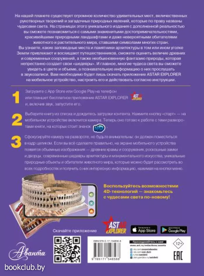 Эта уникальная энциклопедия с дополненной реальностью познакомит любознательных ребят с самыми знаменитыми чудесами света. На страницах издания интересно и доступно рассказано о древних городах и святилищах, величественных храмах и крепостях, грандиозных пирамидах и дворцах, роскошных садах и парках, потрясающих бухтах и водопадах, затерянных каньонах и лагунах, грозных вулканах и таинственных подземных реках и даже об удивительных растениях и животных. Кроме описаний невероятных творений человека и природы, достойных называться словом "чудо", книга содержит красочные иллюстрации и подробные карты. И главное: увидеть величайшие памятники прошлого, шедевры современности, а также необыкновенные чудеса природы вы сможете в цвете и объеме, а познавательную информацию прослушать в звукозаписи. Вам необходимо будет лишь скачать бесплатное приложение ASTAR EXPLORER на мобильное устройство, настроить его и действовать согласно инструкции.