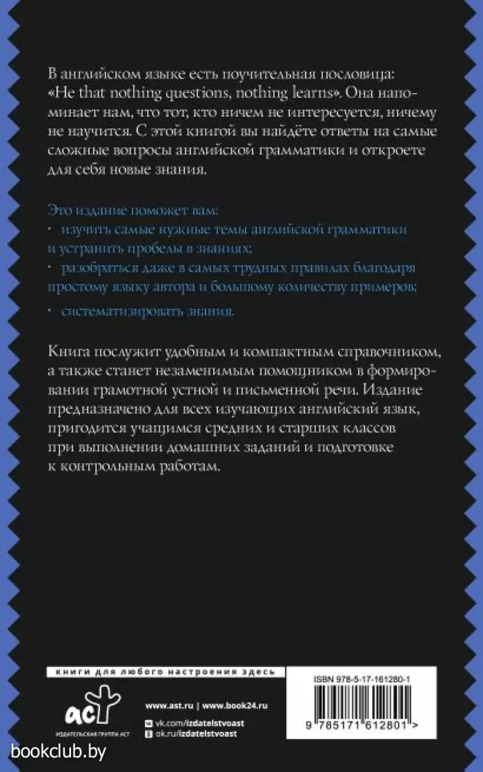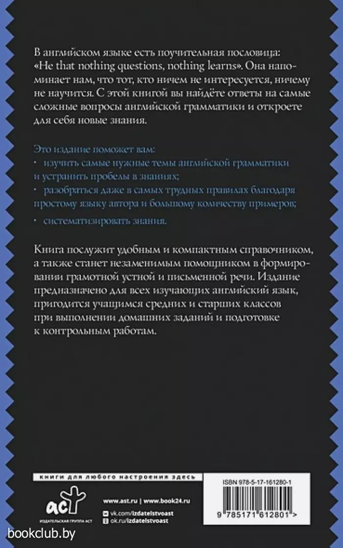 Книга послужит удобным и компактным справочником, а также станет незаменимым помощником в формировании грамотной устной и письменной речи. Издание предназначено для всех изучающих английский язык, пригодится учащимся средних и старших классов при выполнении домашних заданий и подготовке к контрольным работам.