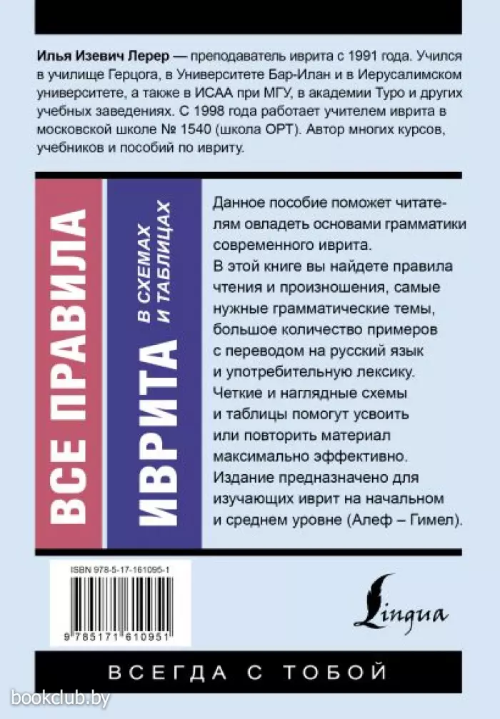 Издание предназначено для всех, кто хочет овладеть грамматикой иврита на начальном и среднем уровне (Алеф – Гимел). Книга от издательства «АСТ», входящая в серию «Эксклюзивный самоучитель», принесет массу положительных впечатлений от прочтения и займет достойное место в вашей библиотеке. Для вашего удобства при оформлении заказа по телефону назовите код товара: 400786