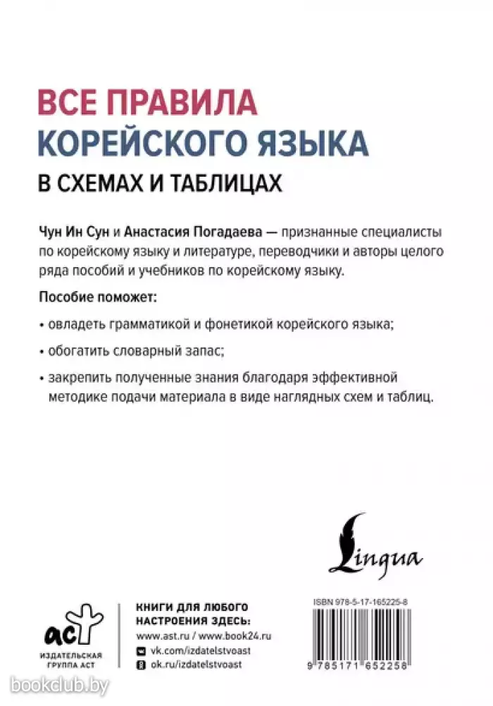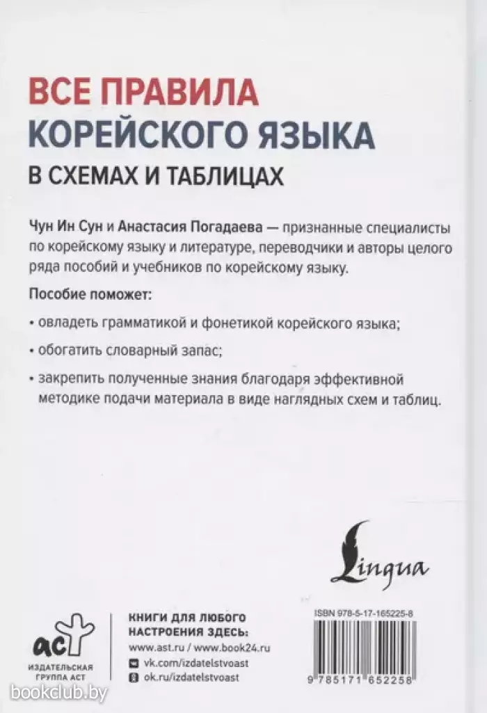 Чун Ин Сун – кандидат филологических наук, доцент ИСАА МГУ, автор и составитель множества учебных пособий и словарей, переводчик корейской художественной литературы. Анастасия Викторовна Погадаева – признанный специалист по корейскому языку и литературе, переводчик, автор ряда пособий и учебников по корейскому языку. Данное учебное пособие содержит лексический и грамматический материал для изучения корейского языка с нулевого уровня. Здесь вы найдете наглядные таблицы и схемы, описывающие основные грамматические правила корейского языка. Применение этих правил показано на множестве примеров. Также в спра- вочнике есть раздел, посвященный фонетике и письму. Книга дополнена полезной лексикой по темам, корейско-русским и русско-корейским словарями. Пособие адресовано всем, кто изучает корейский язык.