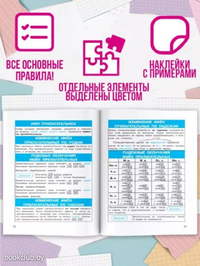 «Все правила по русскому языку» — это справочное пособие для учеников начальной школы. На его страницах в простой и наглядной форме представлены все основные правила по русскому языку, изучаемые в 1−4 классах. Цветовое выделение отдельных элементов текста облегчает запоминание информации, делает процесс обучения эффективным. Также под обложкой ученик найдёт цветные наклейки-шпаргалки — надёжную памятку, которая позволит школьнику легко освоить алфавит, выучить падежи, запомнить падежные вопросы, научиться определять главные и второстепенные члены предложения.