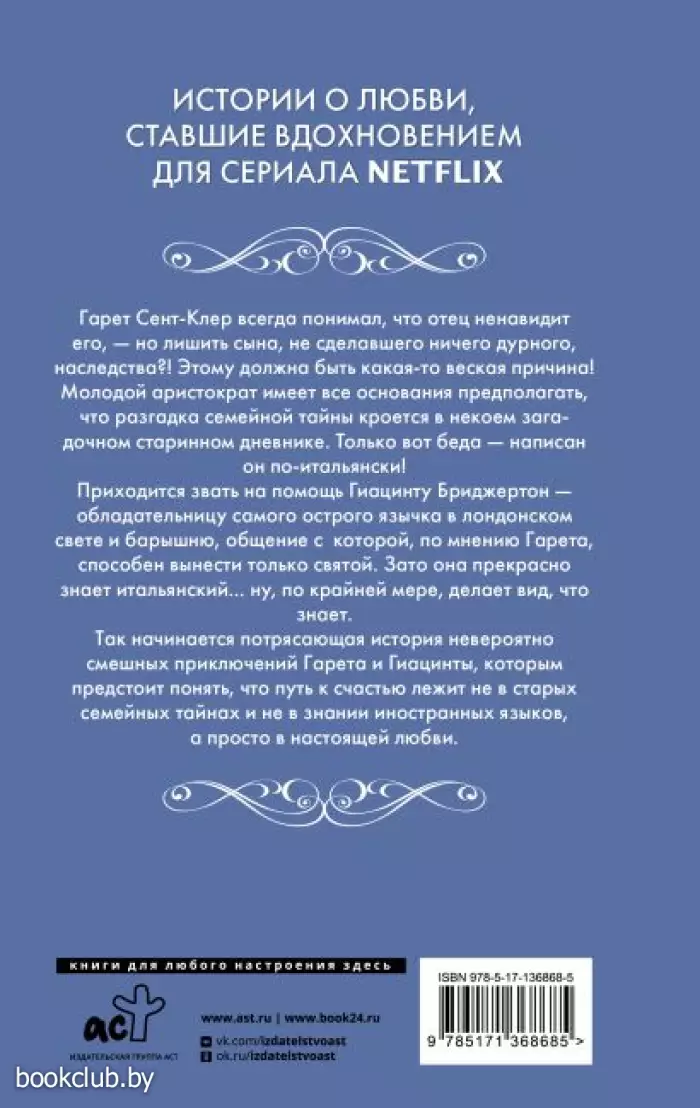Седьмая книга цикла «Бриджертоны» повествует о приключениях Гиацинты Бриджертон — младшей дочери Вайолет и Эдмунда. Гарет Сент-Клер всегда понимал, что отец ненавидит его, — но лишить сына, не сделавшего ничего дурного, наследства?! Этому должна быть какая-то веская причина! Молодой аристократ имеет все основания предполагать, что разгадка семейной тайны кроется в некоем загадочном старинном дневнике. Только вот беда — написан он по-итальянски!Приходится звать на помощь Гиацинту Бриджертон — обладательницу самого острого язычка в лондонском свете и барышню, общение с которой, по мнению Гарета, способен вынести только святой. Зато она прекрасно знает итальянский… ну, по крайней мере, делает вид, что знает.Так начинается потрясающая история невероятно смешных приключений Гарета и Гиацинты, которым предстоит понять, что путь к счастью лежит не в старых семейных тайнах и не в знании иностранных языков, а просто внастоящей любви.