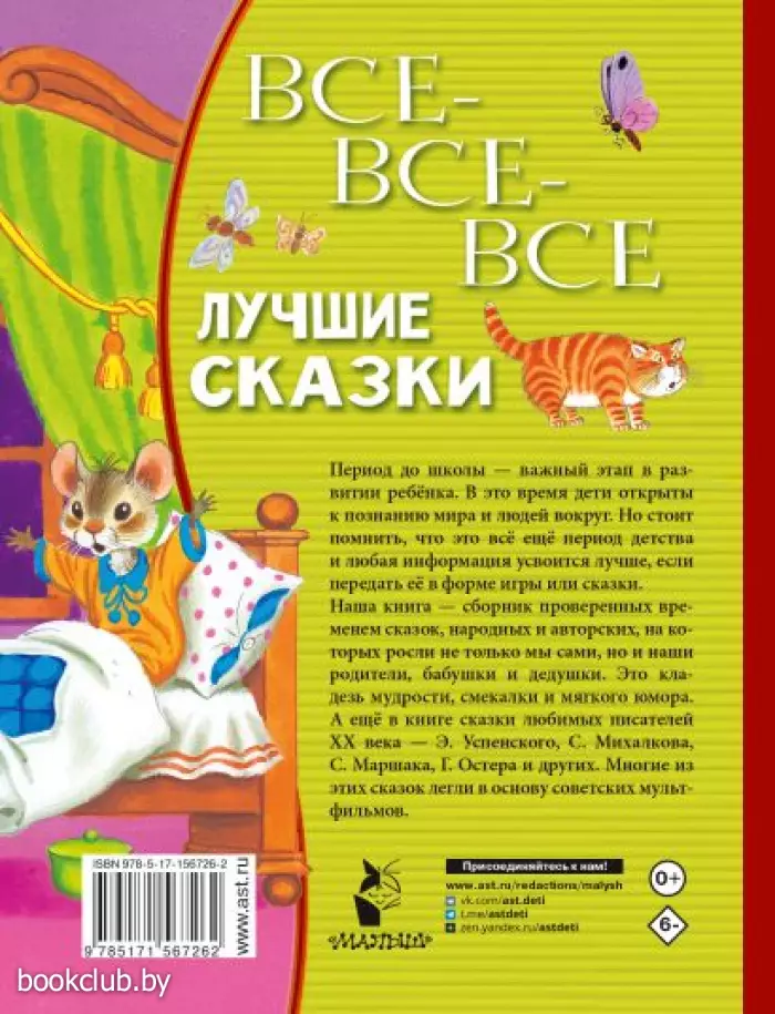 Период до школы – важный этап развития ребёнка. В это время дети открыты к познанию мира и людей вокруг. Но стоить помнить, что это всё ещё период детства, и любая информация усвоится лучше, если передать её в форме игры или сказки. Наша книга – сборник проверенных временем сказок, на которых росли мы сами, наши родители, бабушки и дедушки. Это кладезь народной мудрости, смекалки и мягкого юмора. Также в книге читатель найдёт и сказки любимых писателей XX века – Э. Успенского, С. Михалкова, С. Маршака, Г. Остера и других, по многим из которых в советское время были сняты мультфильмы.
