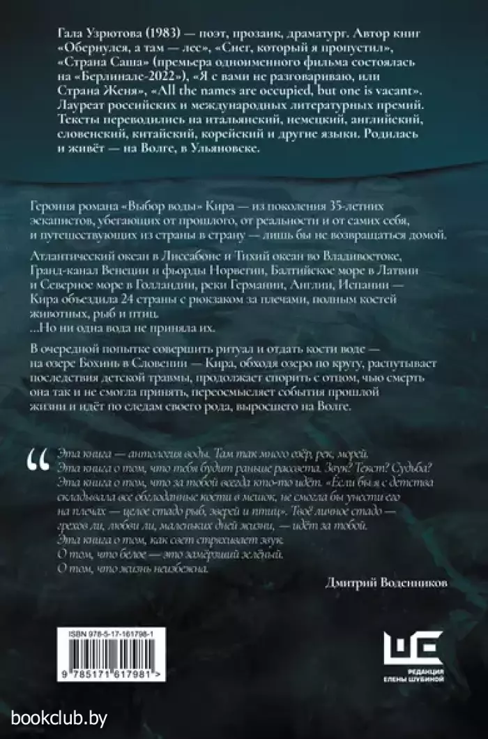 Героиня романа «Выбор воды» Кира — из поколения 35‑летних эскапистов, убегающих от прошлого, от реальности и от самих себя, и путешествующих из страны в страну — лишь бы не возвращаться домой.