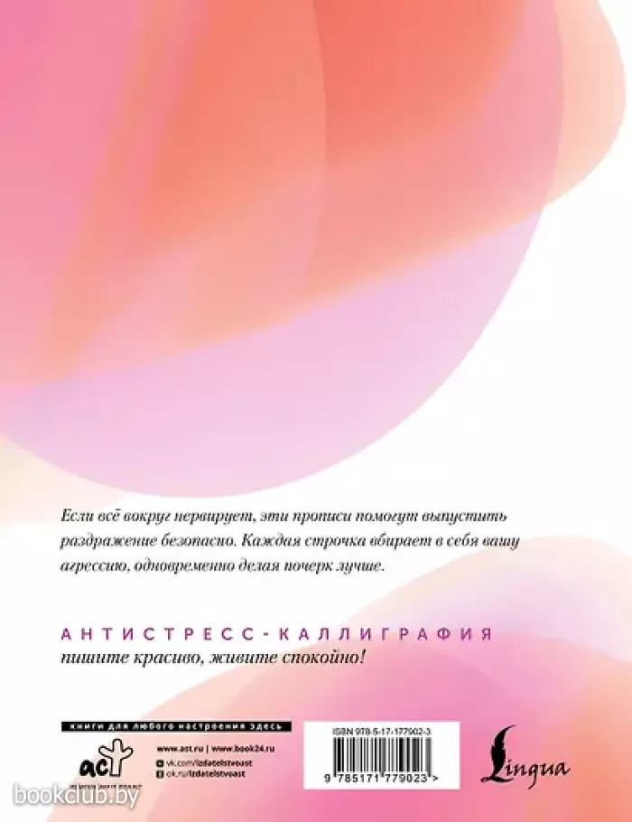 Книги издательства «АСТ» из серии «Антистресс-каллиграфия» станут прекрасным дополнением вашей библиотеки. Для вашего удобства при оформлении заказа по телефону назовите код товара: 416395