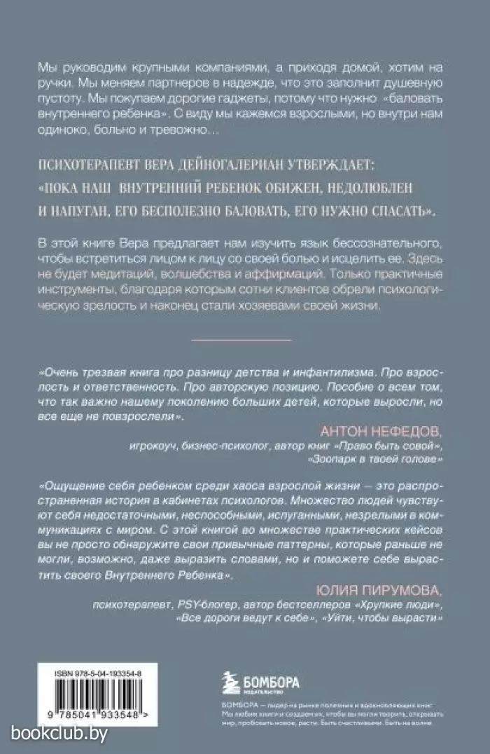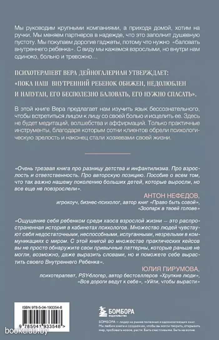 Психотерапевт Вера Дейногалериан утверждает: «Пока наш внутренний ребенок обижен, недолюблен и напуган, его бесполезно баловать, — его нужно спасать». В этой книге Вера предлагает нам изучить язык бессознательного, чтобы встретиться лицом к лицу со своей болью и исцелить ее. Здесь не будет медитаций, волшебства и аффирмаций. Только практичные инструменты, благодаря которым сотни клиентов обрели психологическую зрелость и наконец стали хозяевами своей жизни.