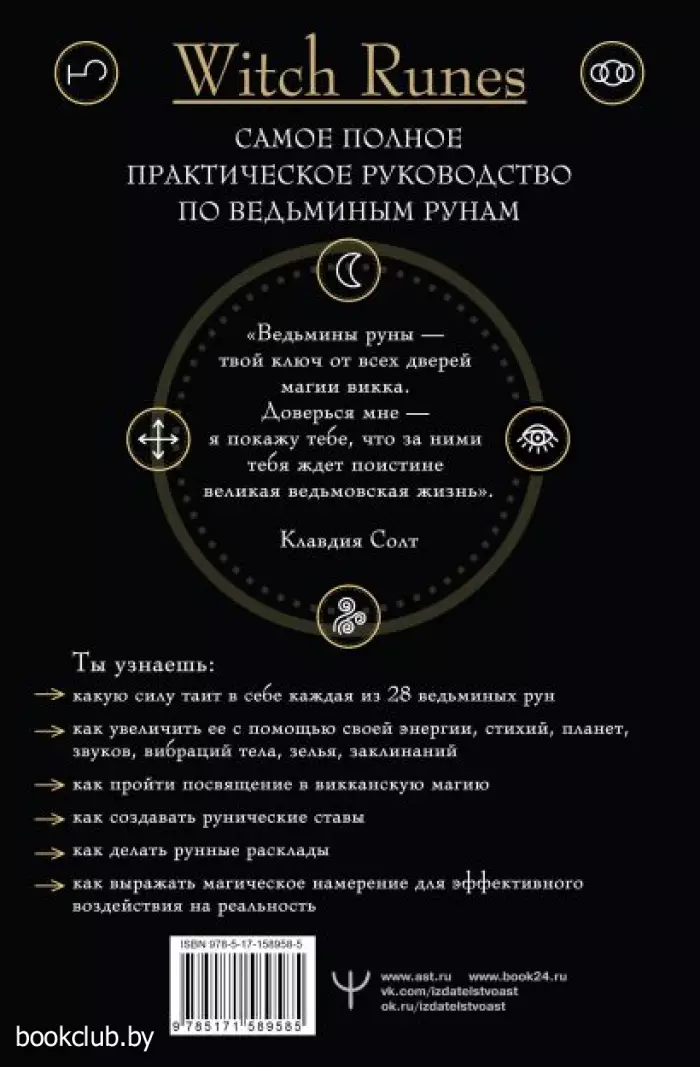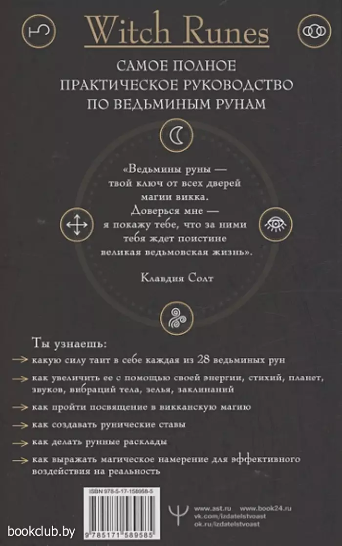 Ведьмины руны — особые древние знаки магии викка, которые обладают огромной энергией и способны оказывать мощное воздействие на все миры, включая физический. Для современной ведьмы руны могут стать эффективным инструментом влияния на законы Вселенной и создания своей счастливой реальности. Клавдия Солт — первая, кто подробно изложил великое знание о ведьминых рунах в книге.