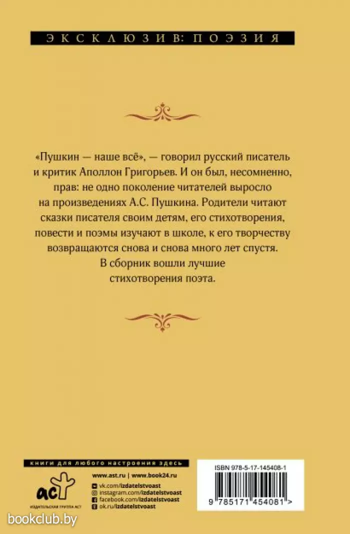 Книги издательства «АСТ» из серии «Эксклюзив: поэзия» - правильный выбор и отличное приобретение. Для вашего удобства при оформлении заказа по телефону назовите код товара: 154410