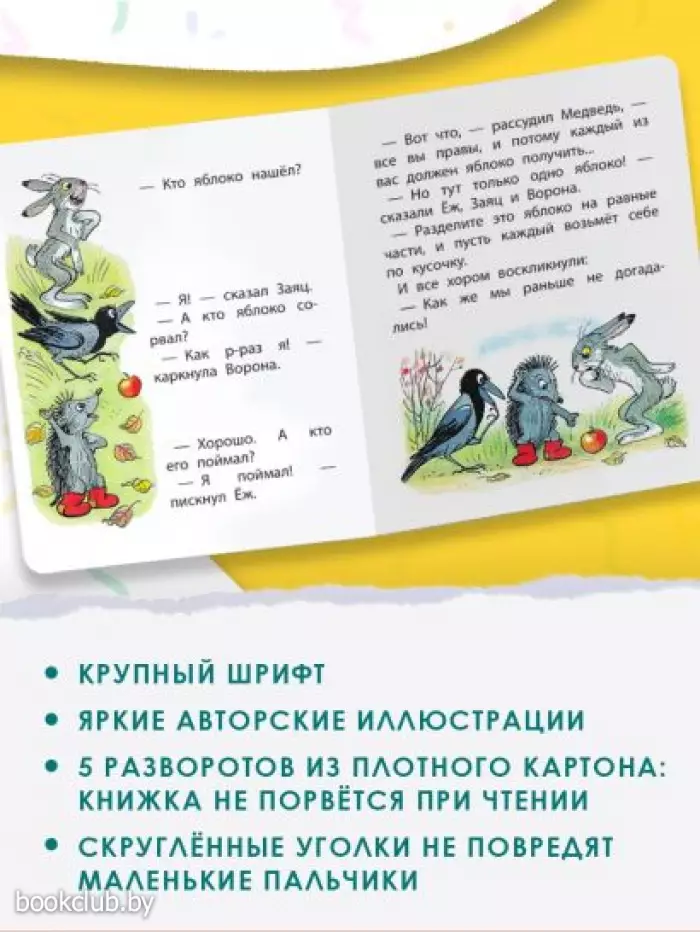 Нашли однажды звери в осеннем лесу яблоко. Стали думать: кому его отдать полагается? Ведь Заяц яблоко увидел, Ворона сорвала, а Ёж – поймал. Едва не подрались друзья из-за яблока, но тут на помощь пришёл Медведь и рассудил справедливо. А как ему это удалось – узнаете из этой книжки!