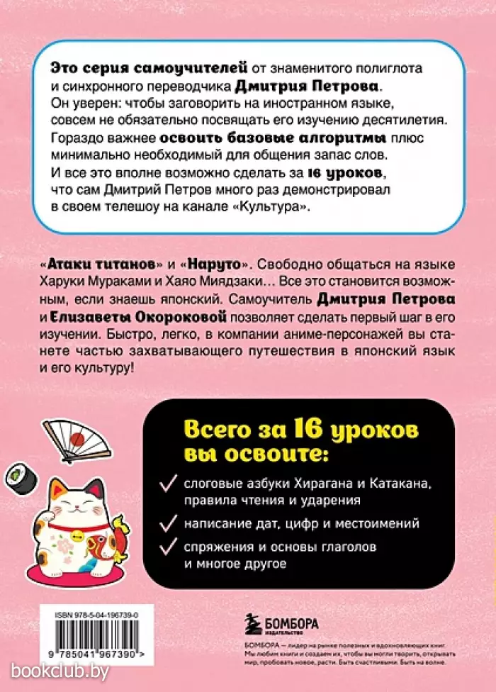 Это серия самоучителей от знаменитого полиглота и синхронного переводчика Дмитрия Петрова. Он уверен: чтобы заговорить на иностранном языке, совсем не обязательно посвящать его изучению десятилетия. Гораздо важнее освоить базовые алгоритмы, плюс — минимально необходимый для общения запас слов.