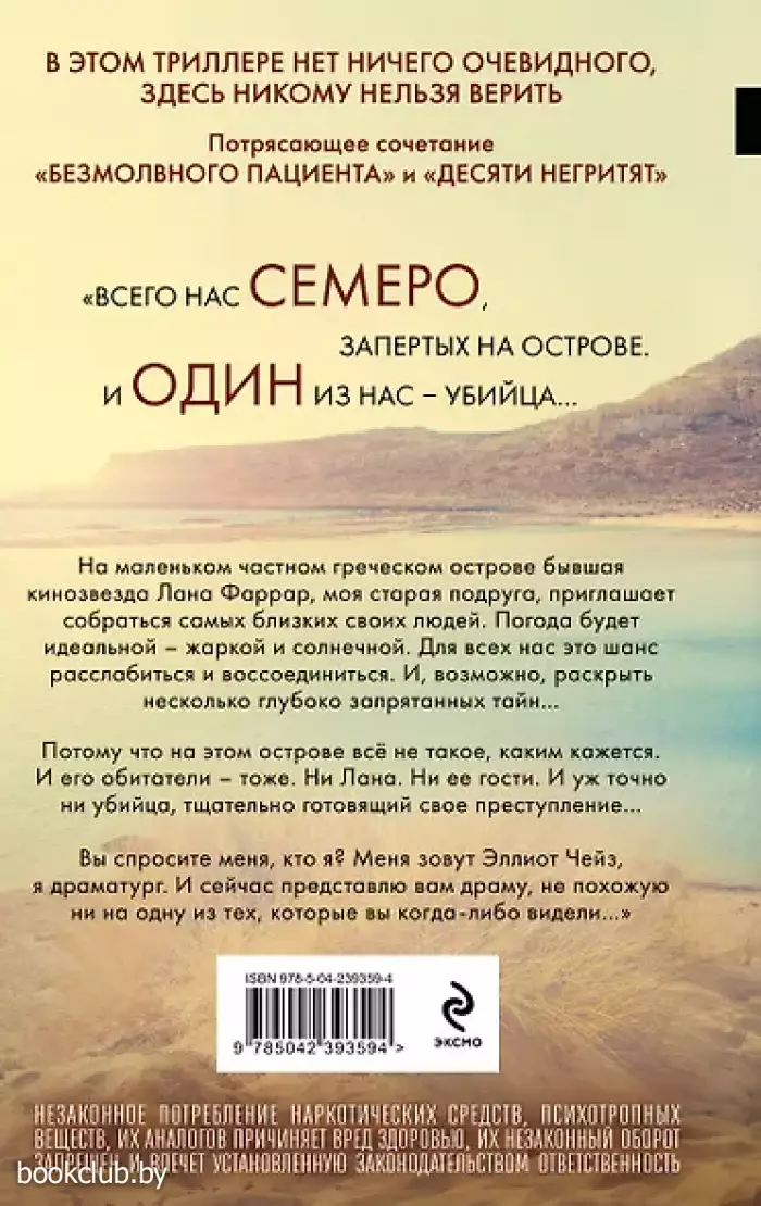 НЕЗАКОННОЕ ПОТРЕБЛЕНИЕ НАРКОТИЧЕСКИХ СРЕДСТВ, ПСИХОТРОПНЫХ ВЕЩЕСТВ, ИХ АНАЛОГОВ ПРИЧИНЯЕТ ВРЕД ЗДОРОВЬЮ, ИХ НЕЗАКОННЫЙ ОБОРОТ ЗАПРЕЩЕН И ВЛЕЧЕТ УСТАНОВЛЕННУЮ ЗАКОНОДАТЕЛЬСТВОМ ОТВЕТСТВЕННОСТЬ.ОТ АВТОРА БЕСТСЕЛЛЕРА № 1 В МИРЕ В 2019—2021 гг. «БЕЗМОЛВНЫЙ ПАЦИЕНТ». МОМЕНТАЛЬНЫЙ БЕСТСЕЛЛЕР SUNDAY TIMES И NEW YORK TIMES. В этом триллере нет ничего очевидного, здесь никому нельзя верить. Потрясающее сочетание «Безмолвного пациента» и «Десяти негритят». «Всего нас семеро, запертых на острове. И один из нас — убийца… На маленьком частном греческом острове бывшая кинозвезда Лана Фаррар, моя старая подруга, приглашает собраться самых близких своих людей. Погода будет идеальной — жаркой и солнечной. Для всех нас это шанс расслабиться и воссоединиться. И, возможно, раскрыть несколько глубоко запрятанных тайн… Потому что на этом острове всё не такое, каким кажется. И его обитатели — тоже. Ни Лана. Ни ее гости. И уж точно ни убийца, тщательно готовящий свое преступление… Вы спросите меня, кто я? Меня зовут Эллиот Чейз, я драматург. И сейчас представлю вам драму, не похожую ни на одну из тех, которые вы когда-либо видели…» ______________________________________________________ «Полный триумф — просто блестяще». — Стивен Фрай «Твистов и поворотов сюжета здесь хватит на два романа». — Дэвид Болдаччи «Это мой любимый роман Михаэлидеса — безусловного мастера сюжетных твистов». — Люси Фоли «Классическая запутанная детективная история убийства. Прекрасно прорисованный состав персонажей… вы будете гадать, кто убийца, до самого финала, который шокирует вас. Умно и чертовски весело». — Крис Уитакер «Бесконечно развивающийся, безумно интересный роман, концовку которого невозможно предсказать. Как только вы думаете, что загнали сюжет в угол, он выворачивается и с ошеломляющим размахом движется к сокрушительному финалу. Это "Талантливый мистер Рипли" нашего времени». — Блейк Крауч «Одна из тех редких книг, где все на самом деле не так, как кажется. Как всегда, Алекс Михаэлидис не разочаровывает». — Рагнар Йонассон «Мастер-класс саспенса». — Стив Кавана Книги издательства «ЭКСМО» из серии «Главный триллер года» станут прекрасным дополнением вашей библиотеки. Для вашего удобства при оформлении заказа по телефону назовите код товара: 416998