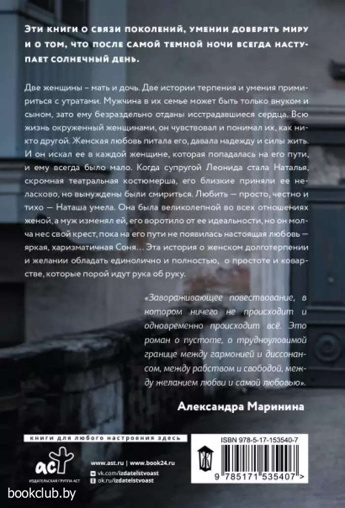 Две женщины – мать и дочь. Две истории терпения и умения примириться с утратами. Мужчина в их семье может быть только внуком и сыном, зато ему безраздельно отданы исстрадавшиеся сердца. Всю жизнь окруженный женщинами, Леонид чувствовал и понимал их, как никто другой. Женская любовь питала его, давала надежду и силы жить. И он искал ее в каждой женщине, которая попадалась на его пути, и ему всегда было мало. Когда супругой Лени стала Наталья, скромная театральная костюмерша, его близкие приняли ее неласково, но вынуждены были смириться. Наташа была великолепной во всех отношениях женой, а муж изменял ей, его воротило от ее идеальности, но он молча нес свой крест, пока на его пути не появилась яркая, харизматичная Соня… Эта история о женском долготерпении и желании обладать единолично и полностью, простоте и коварстве, которые порой идут рука об руку.
