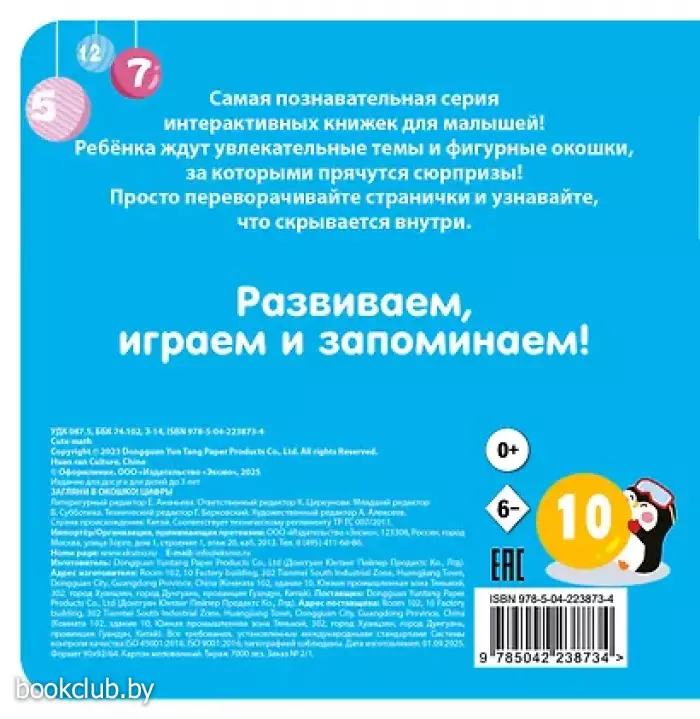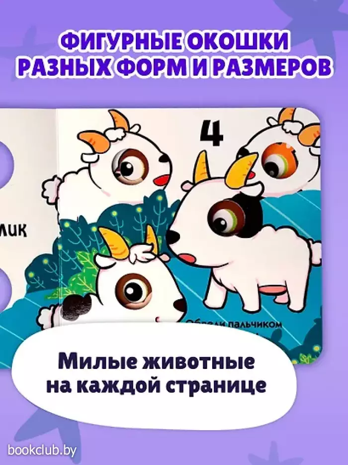 Интерактивная обучающая книжка-игрушка с фигурными окошками для малышей от 1 до 3 лет. Развивает мелкую моторику, внимание и память, учит считать и расширяет словарный запас. Загляни в окошко! Друзья-зверята собираются вместе на полянке. Одна панда, два слоненка, три павлина… Попробуем их сосчитать? Скорее открывай книжку, будем учиться вместе! На страничках тебя ждут фигурные окошки, цифры и новые слова. Играй, запоминай и тренируй пальчики! Окошки разных форм и размеров создают углубленный рельеф, который хочется трогать снова и снова! Милые герои и яркие картинки, безопасные материалы и скругленные углы делают эту книжку-игрушку отличным подарком по любому поводу для мальчиков и девочек. Книга идеально подходит для первого знакомства с цифрами, а небольшой формат позволяет легко держать ее в маленьких ручках во время игры с мамой и папой, читать дома или брать с собой в дорогу. Книга от издательства «ЭКСМО», входящая в серию «Загляни в окошко!», принесет массу положительных впечатлений от прочтения и займет достойное место в вашей библиотеке. Для вашего удобства при оформлении заказа по телефону назовите код товара: 417044