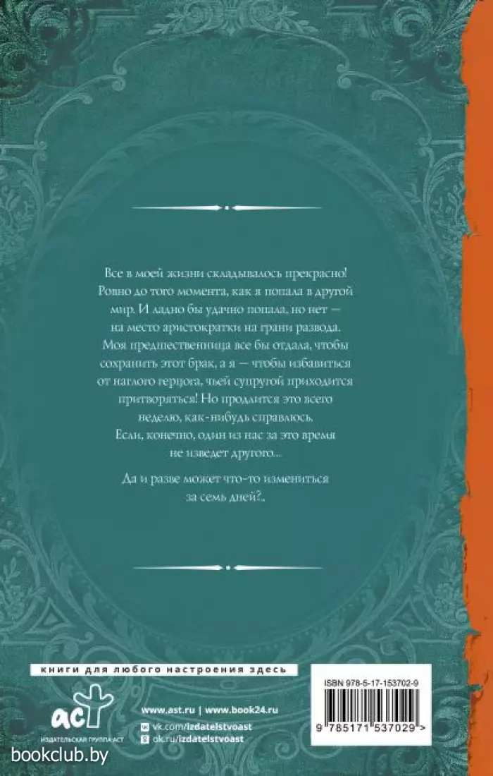 Все в моей жизни складывалось прекрасно! Ровно до того момента, как я попала в другой мир. И ладно бы удачно попала, но нет — на место аристократки на грани развода. Моя предшественница все бы отдала, чтобы сохранить этот брак, а я — чтобы избавиться от наглого герцога, чьей супругой приходится притворяться! Но продлится это всего неделю, как-нибудь справлюсь. Если, конечно, один из нас за это время не изведет другого… Да и разве может что-то измениться за семь дней?..