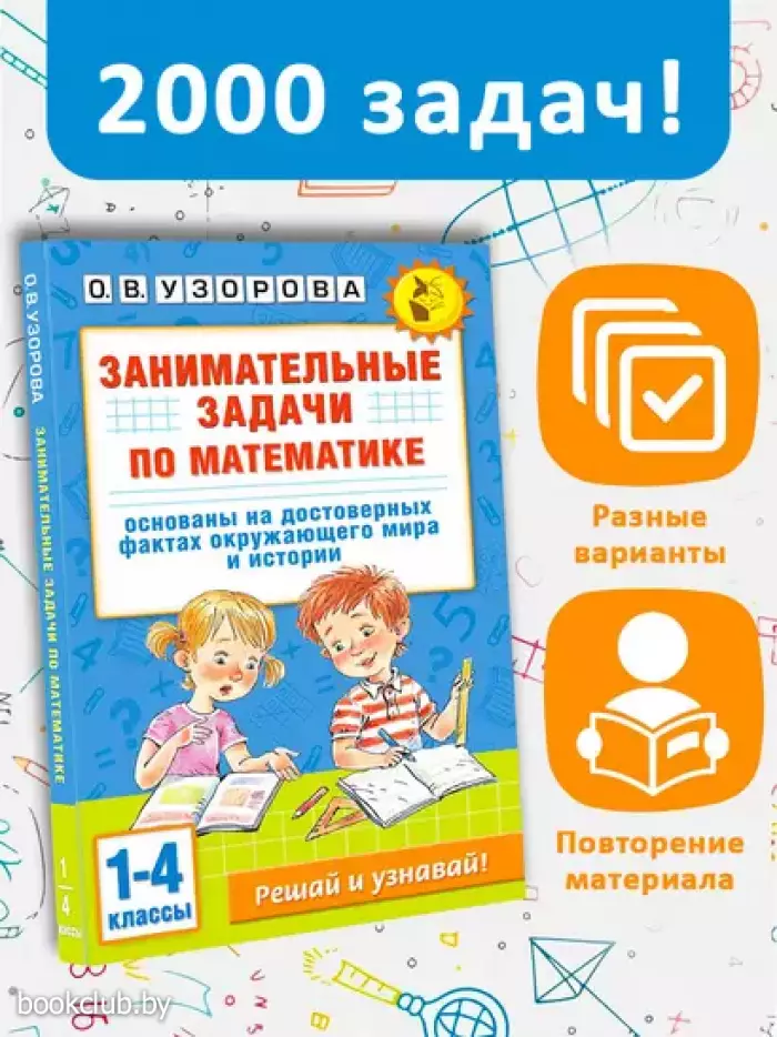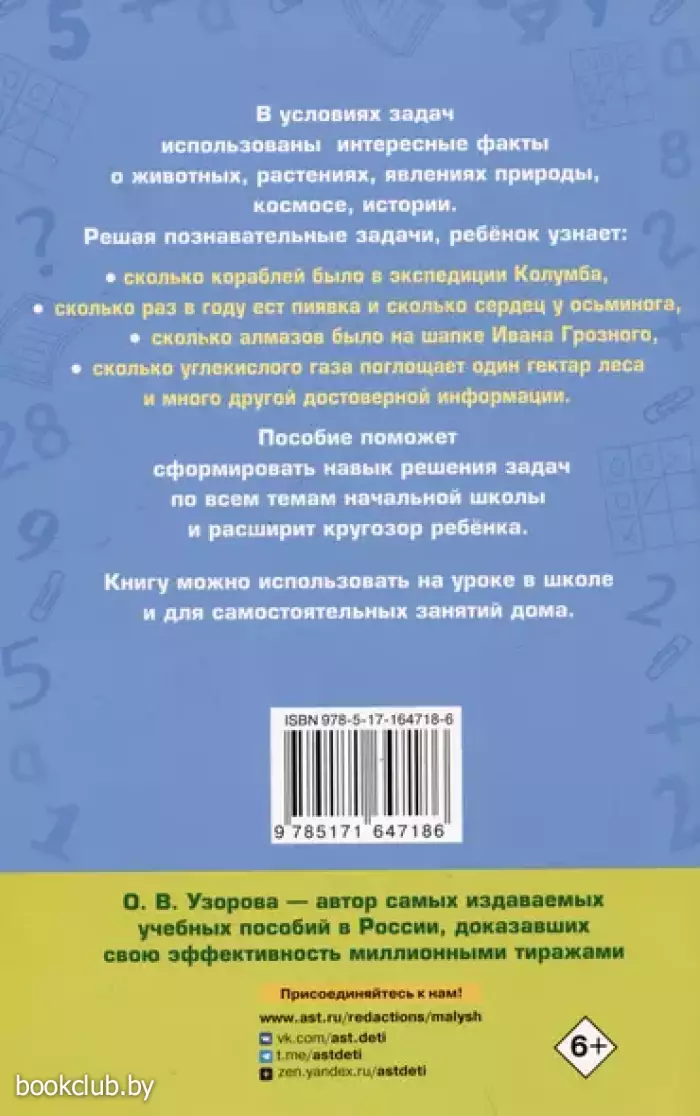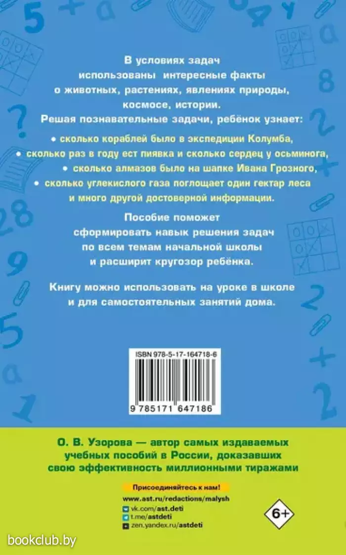 Сборник содержит задачи на все темы курса математики начальной школы, решая которые ребёнок знакомится с интересными фактами истории, узнаёт много любопытного из жизни животных, растений и явлениях природы. Для закрепления изученного и проверки знаний предложены зачеты по каждой теме. Книгу можно использовать на уроке в школе и для самостоятельных занятий дома. Для начального образования.
