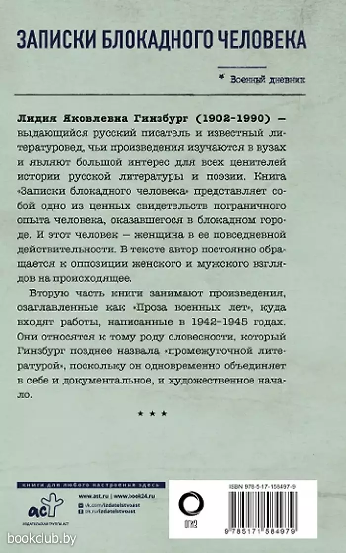 Лидия Яковлевна Гинзбург (1902–1990) – выдающийся русский писатель и известный литературовед, чьи произведения изучают в вузах и являют большой интерес для всех ценителей истории русской литературы и поэзии. Ее произведение «Записки блокадного человека» представляет собой одно из ценных свидетельств пограничного опыта человека, оказавшегося в блокадном городе. И этот человек — женщина в ее повседневной действительности. В тексте автор постоянный обращается к оппозиции женского и мужского взглядов на происходящее.