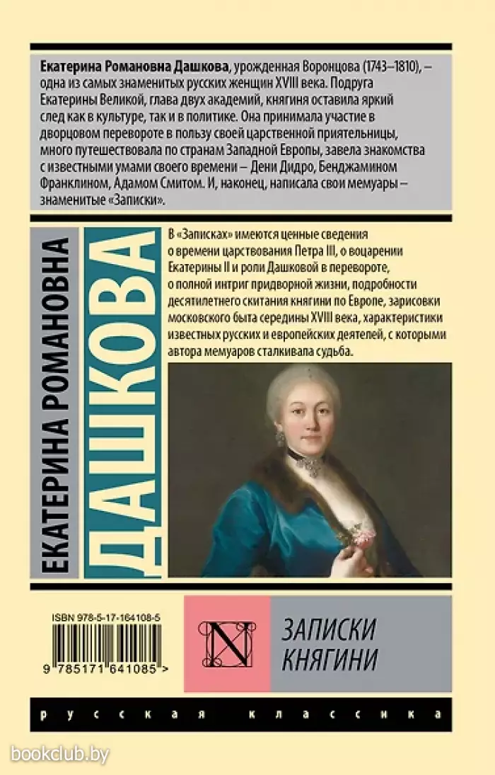Екатерина Романовна Дашкова, урожденная Воронцова (1743-1810) – одна из самых знаменитых русских женщин XVIII века. Подруга Екатерины Великой, глава двух академий, княгиня оставила яркий след как в культуре, так и в политике. Она принимала участие в дворцовом перевороте в пользу своей царственной приятельницы, много путешествовала по странам Западной Европы, завела знакомства с известными умами своего времени – Дени Дидро, Бенджамином Франклином, Адамом Смитом. И, наконец, написала свои мемуары – знаменитые «Записки». В «Записках» имеются ценные сведения о времени царствования Петра III, о воцарении Екатерины II и роли Дашковой в перевороте, о полной интриг придворной жизни, подробности десятилетнего скитания княгини по Европе, зарисовки московского быта середины XVIII в., характеристики известных русских и европейских деятелей, с которыми автора мемуаров сталкивала судьба.