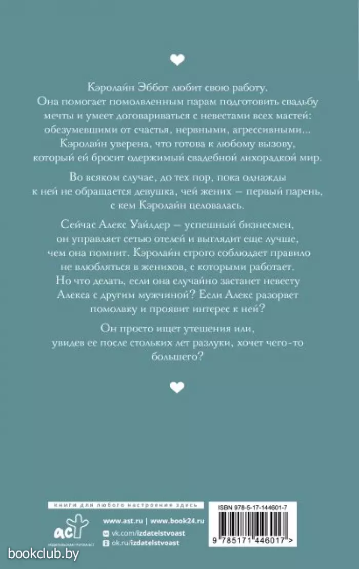 Сейчас Алекс Уайлдер — успешный бизнесмен, он управляет сетью отелей и выглядит еще лучше, чем она помнит. Кэролайн строго соблюдает правило не влюбляться в женихов, с которыми работает. Но что делать, если она случайно застанет невесту Алекса с другим мужчиной? Если Алекс разорвет помолвку и проявит интерес к ней?