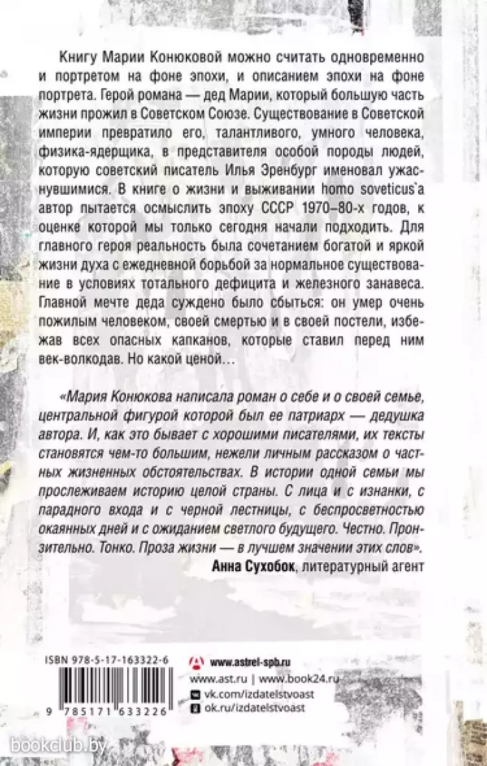 Книгу Марии Конюковой можно считать одновременно и портретом на фоне эпохи, и описанием эпохи на фоне портрета. Герой романа — дед Марии, который большую часть жизни прожил в Советском Союзе. Существование в Советской империи превратило его, талантливого, умного человека, физика-ядерщика, в представителя особой породы людей, которую советский писатель Илья Эренбург именовал ужаснувшимися. В книге о жизни и выживании homo soveticus`а автор пытается осмыслить эпоху СССР 1970–80-х годов, к оценке которой мы только сегодня начали подходить. Для главного героя реальность была сочетанием богатой и яркой жизни духа с ежедневной борьбой за нормальное существование в условиях тотального дефицита и железного занавеса. Главной мечте деда суждено было сбыться: он умер очень пожилым человеком, своей смертью и в своей постели, избежав всех опасных капканов, которые ставил перед ним век-волкодав. Но какой ценой…