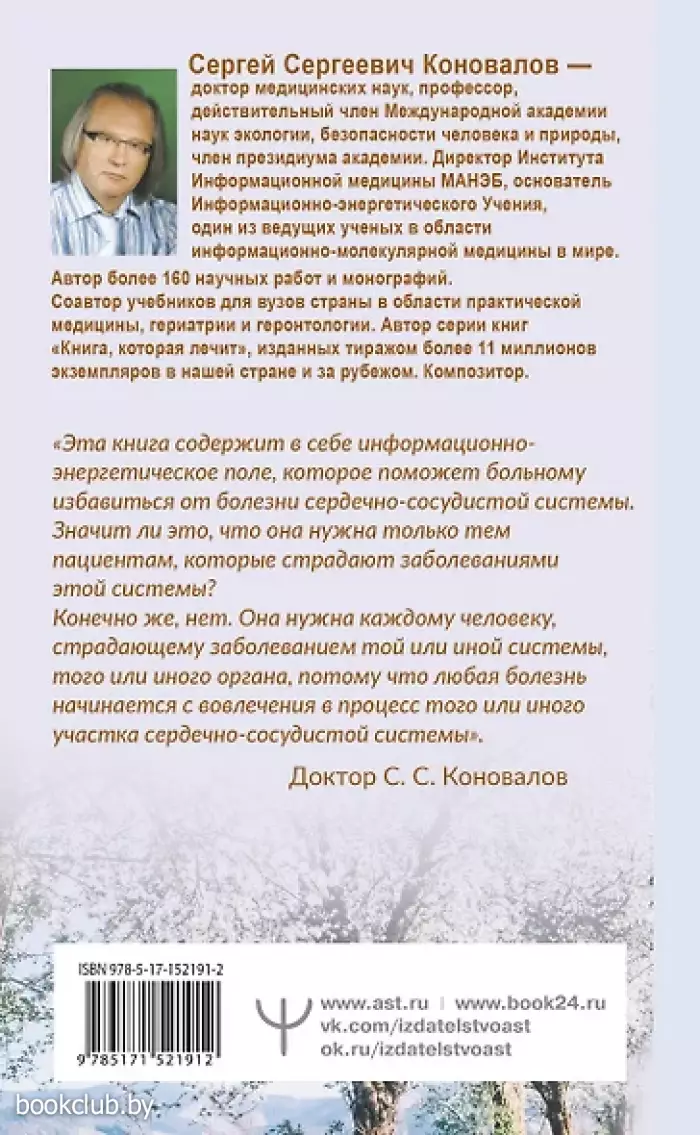 Книга Доктора будет полезна не только тем, кто страдает от патологий сердечно-сосудистой системы, но и каждому, кто хочет жить долго и счастливо, без боли и страданий, расширяя свои знания о мире и постигая законы Информационной Вселенной. Книга от издательства «АСТ», входящая в серию «Доктор Коновалов: Путь к здоровью», принесет массу положительных впечатлений от прочтения и займет достойное место в вашей библиотеке. Для вашего удобства при оформлении заказа по телефону назовите код товара: 412868